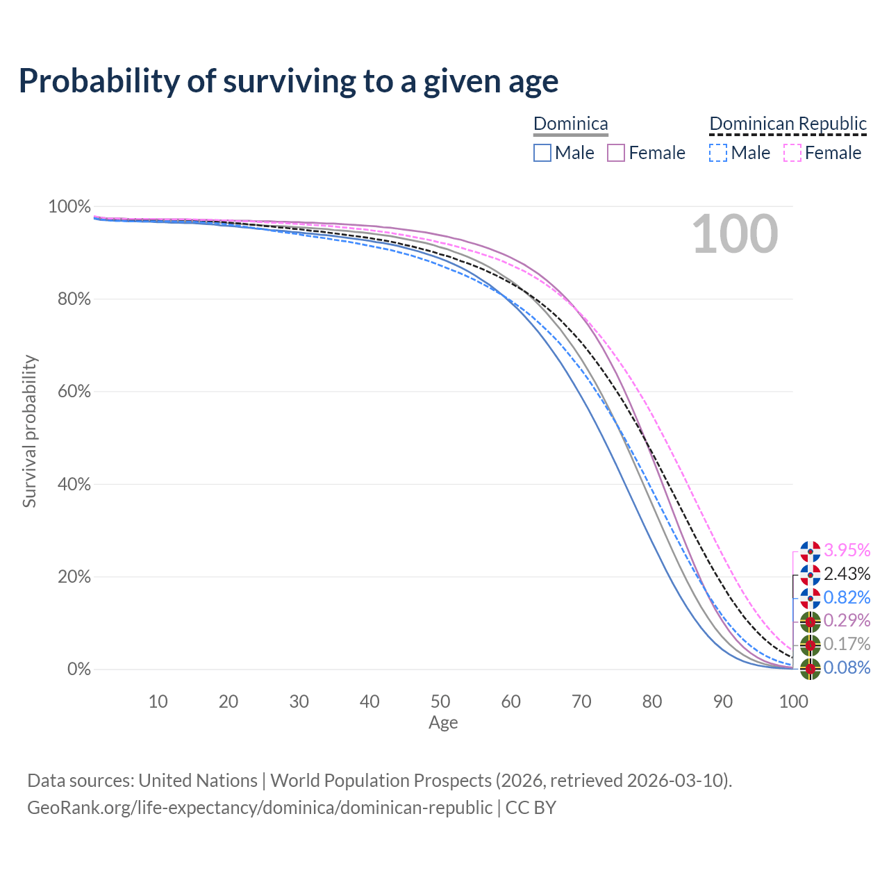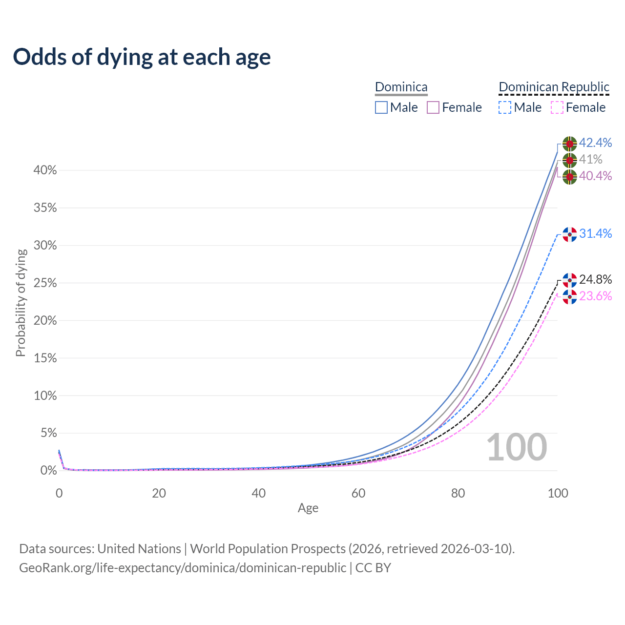 This life expectancy calculator shows the odds of living to 100, 95, 90, and below based on current age for both males and females in Dominica and the Dominican Republic, along with mean and median age of death. The calculations are based on the 2026 life tables (actuarial tables) from the UN World Population Prospects.