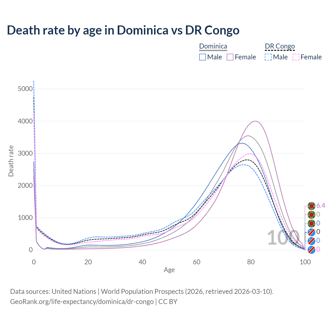 In Dominica, the most common age of death is 79, compared to 0 in the DR Congo. The median age of death is 75.9 in Dominica and 70.9 in the DR Congo, meaning only half of each cohort is expected to live past that age.