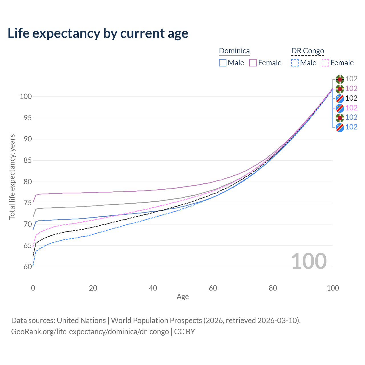 This life expectancy calculator shows the odds of living to 100, 95, 90, and below based on current age for both males and females in Dominica and the DR Congo, along with mean and median age of death. The calculations are based on the 2026 life tables (actuarial tables) from the UN World Population Prospects.