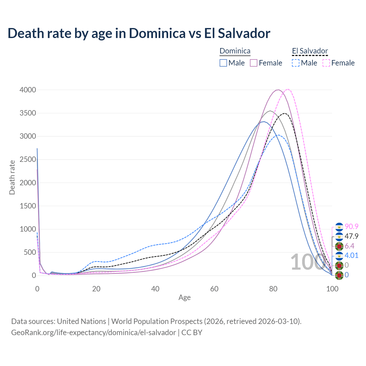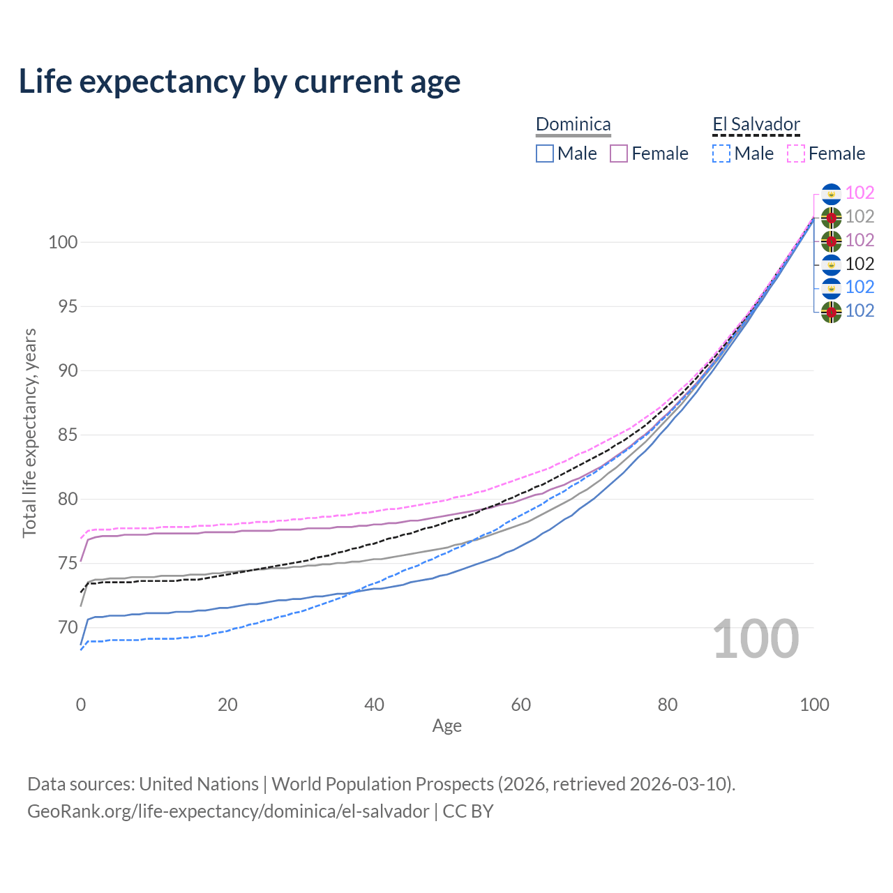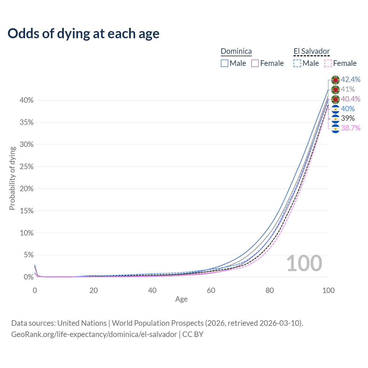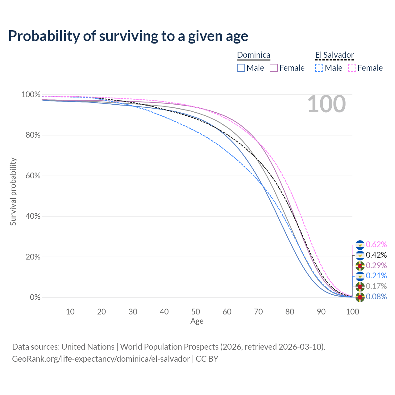 This life expectancy calculator shows the odds of living to 100, 95, 90, and below based on current age for both males and females in Dominica and El Salvador, along with mean and median age of death. The calculations are based on the 2026 life tables (actuarial tables) from the UN World Population Prospects.
