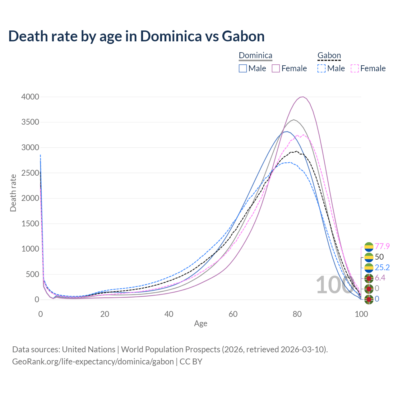 In Dominica, the most common age of death is 79, compared to 80 in Gabon. The median age of death is 75.9 in Dominica and 73.9 in Gabon, meaning only half of each cohort is expected to live past that age.