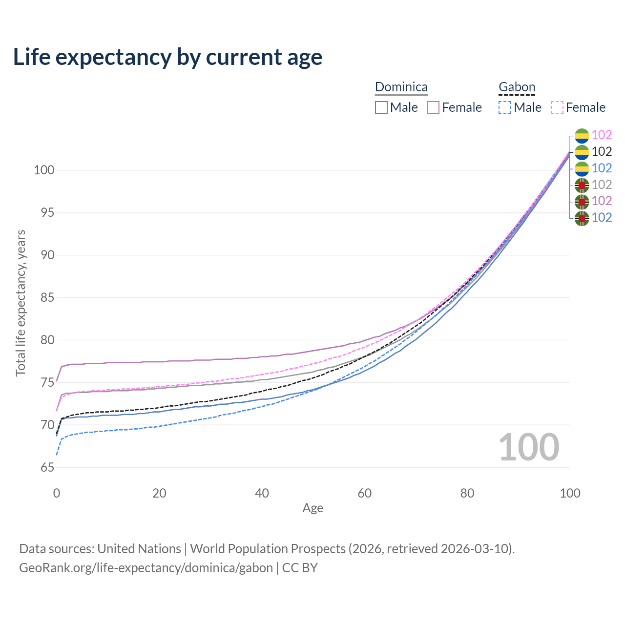 This life expectancy calculator shows the odds of living to 100, 95, 90, and below based on current age for both males and females in Dominica and Gabon, along with mean and median age of death. The calculations are based on the 2026 life tables (actuarial tables) from the UN World Population Prospects.