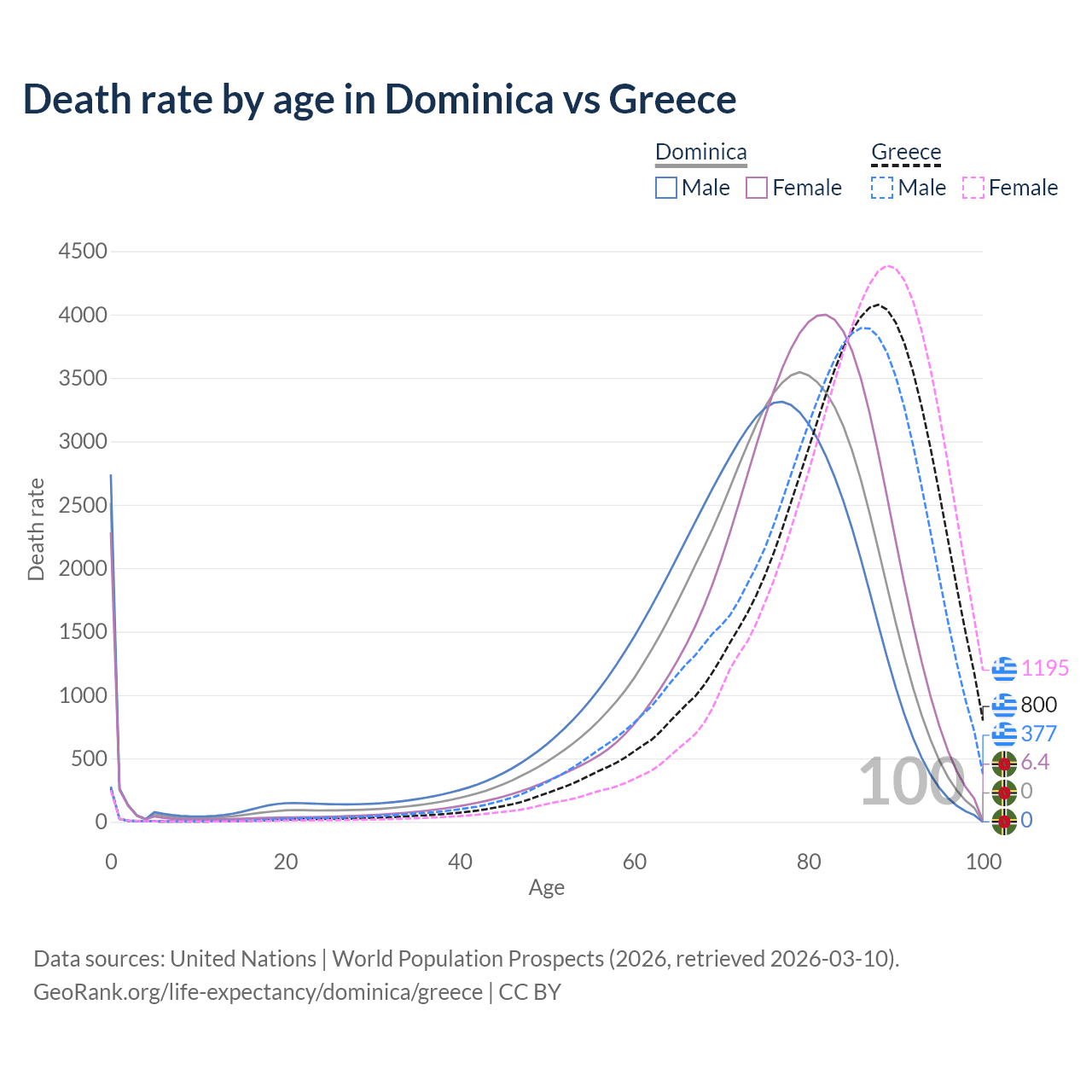 In Dominica, the most common age of death is 79, compared to 88 in Greece. The median age of death is 75.9 in Dominica and 84.9 in Greece, meaning only half of each cohort is expected to live past that age.