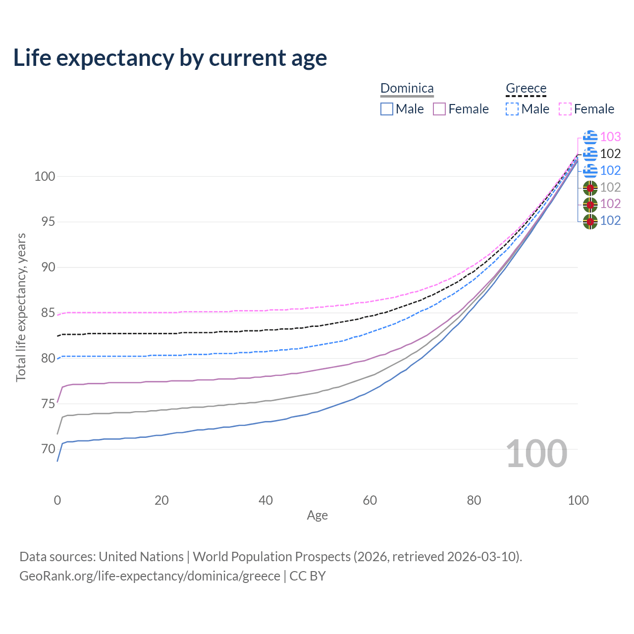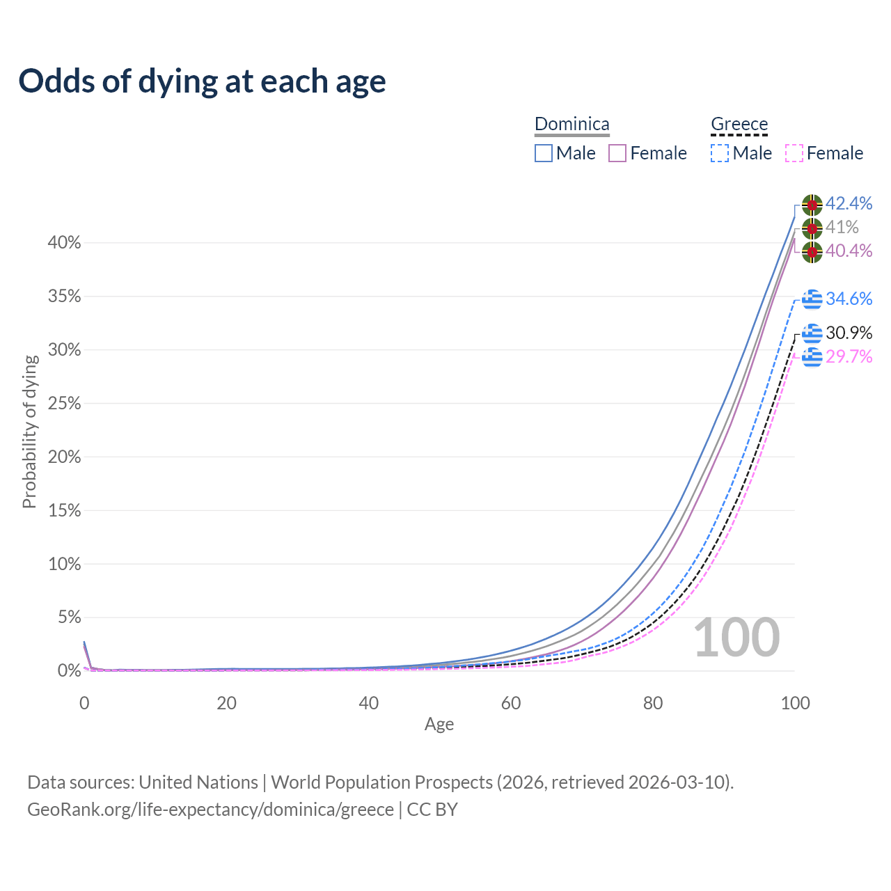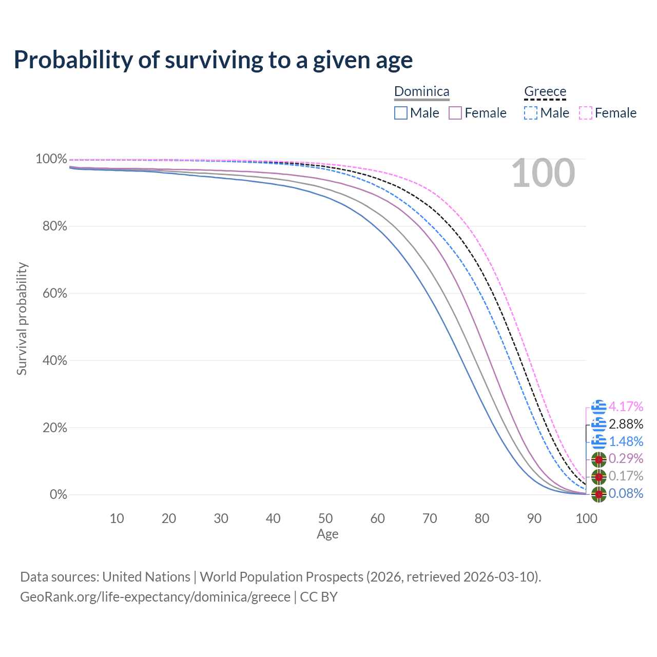 This life expectancy calculator shows the odds of living to 100, 95, 90, and below based on current age for both males and females in Dominica and Greece, along with mean and median age of death. The calculations are based on the 2026 life tables (actuarial tables) from the UN World Population Prospects.