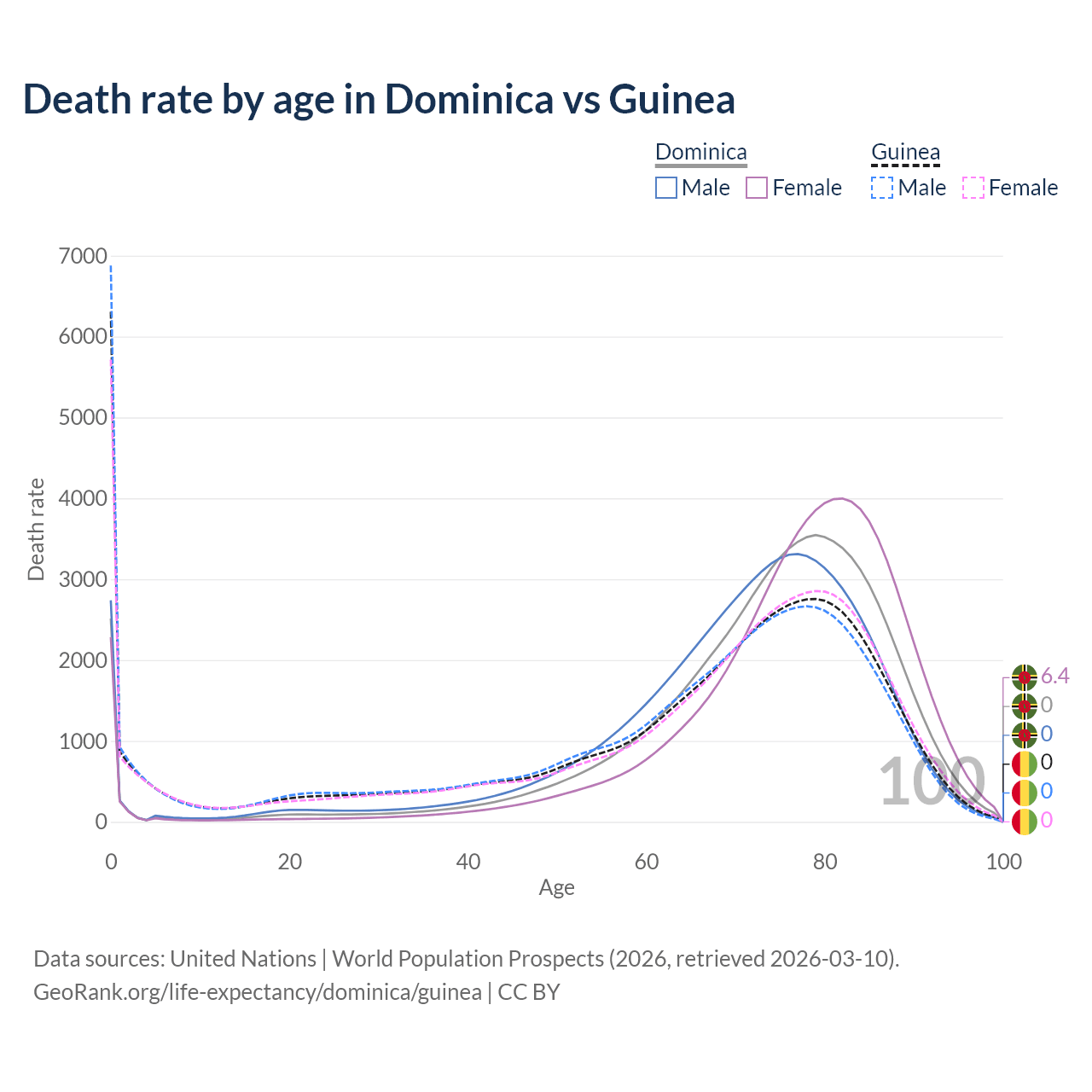 In Dominica, the most common age of death is 79, compared to 0 in Guinea. The median age of death is 75.9 in Dominica and 70.6 in Guinea, meaning only half of each cohort is expected to live past that age.