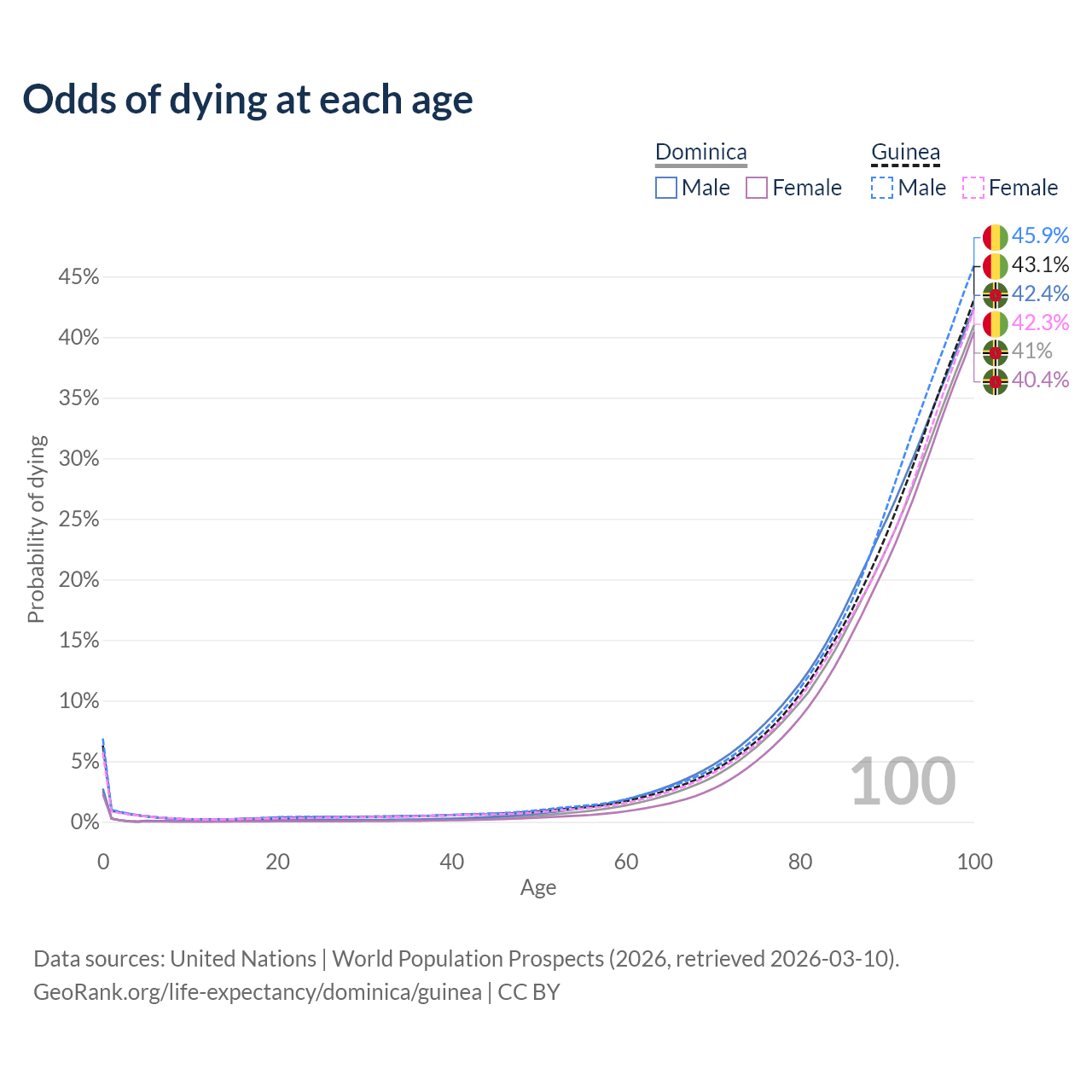 This life expectancy calculator shows the odds of living to 100, 95, 90, and below based on current age for both males and females in Dominica and Guinea, along with mean and median age of death. The calculations are based on the 2026 life tables (actuarial tables) from the UN World Population Prospects.