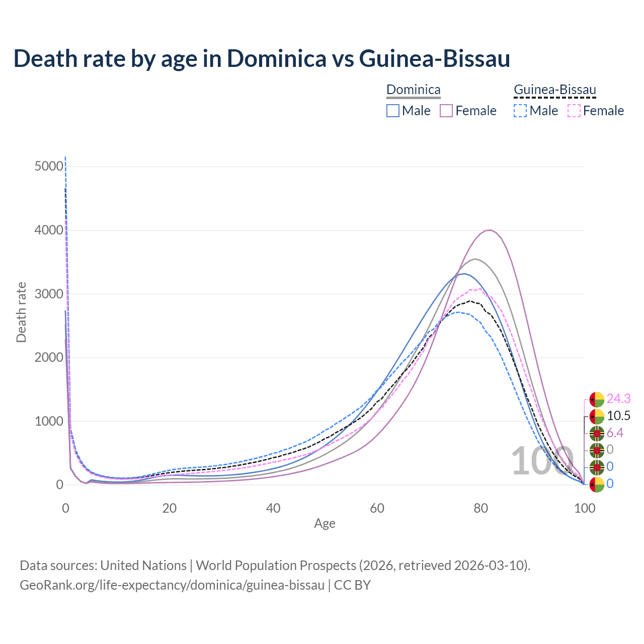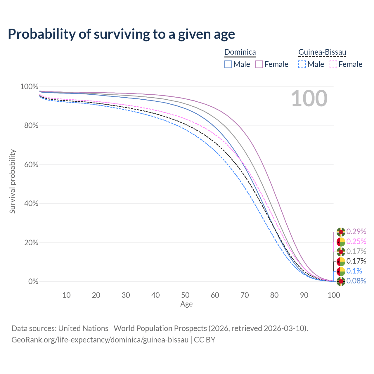 This life expectancy calculator shows the odds of living to 100, 95, 90, and below based on current age for both males and females in Dominica and Guinea-Bissau, along with mean and median age of death. The calculations are based on the 2026 life tables (actuarial tables) from the UN World Population Prospects.