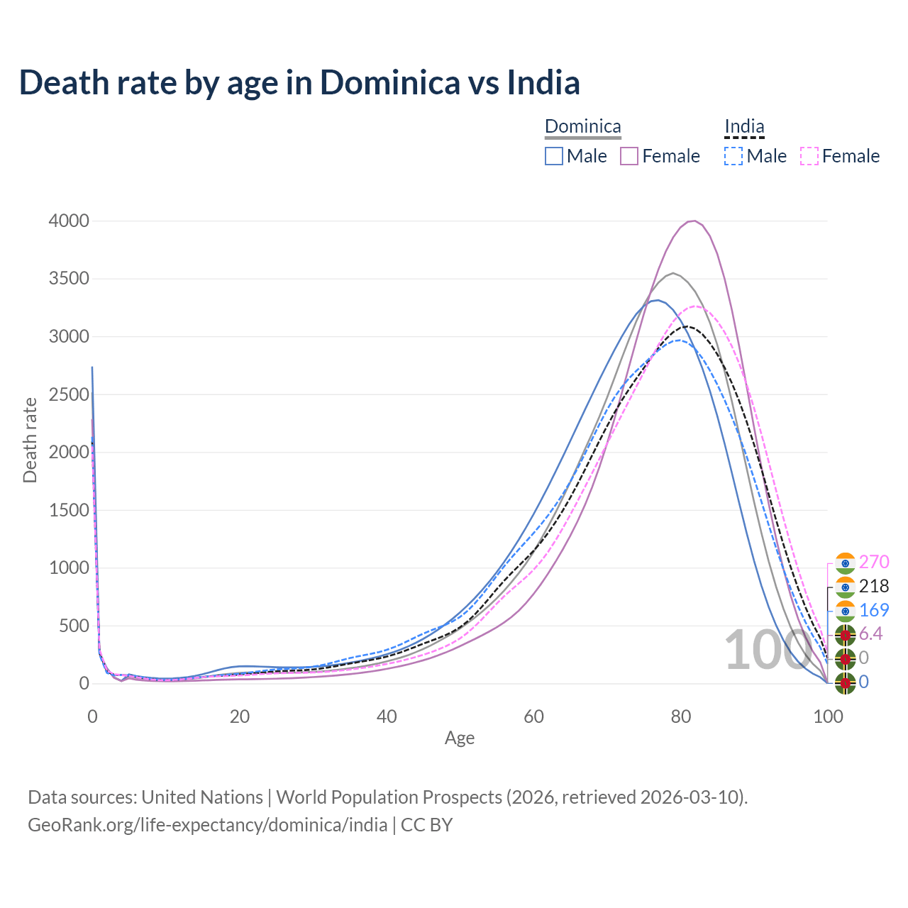 This life expectancy calculator shows the odds of living to 100, 95, 90, and below based on current age for both males and females in Dominica and India, along with mean and median age of death. The calculations are based on the 2026 life tables (actuarial tables) from the UN World Population Prospects.