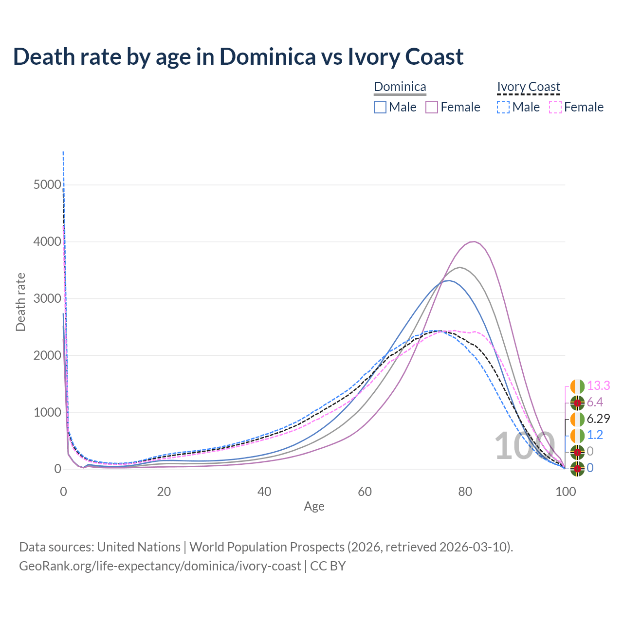 In Dominica, the most common age of death is 79, compared to 0 in Ivory Coast. The median age of death is 75.9 in Dominica and 68.6 in Ivory Coast, meaning only half of each cohort is expected to live past that age.