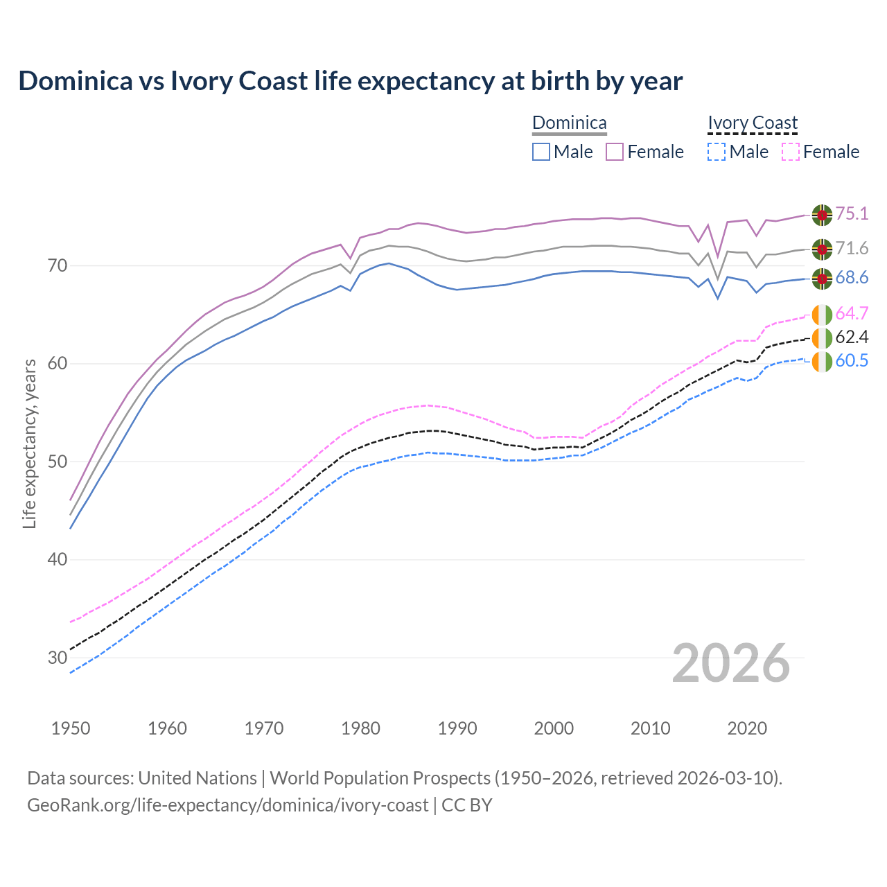 The average life expectancy at birth is 71.6 years in Dominica vs 62.4 in Ivory Coast. Dominica is ranked 128/197 by life expectancy, and Ivory Coast is 184/197. In Dominica, the life expectancy is 68.6 years for males and 75.1 years for females. In Ivory Coast, it's 60.5 years for males and 64.7 years for females.