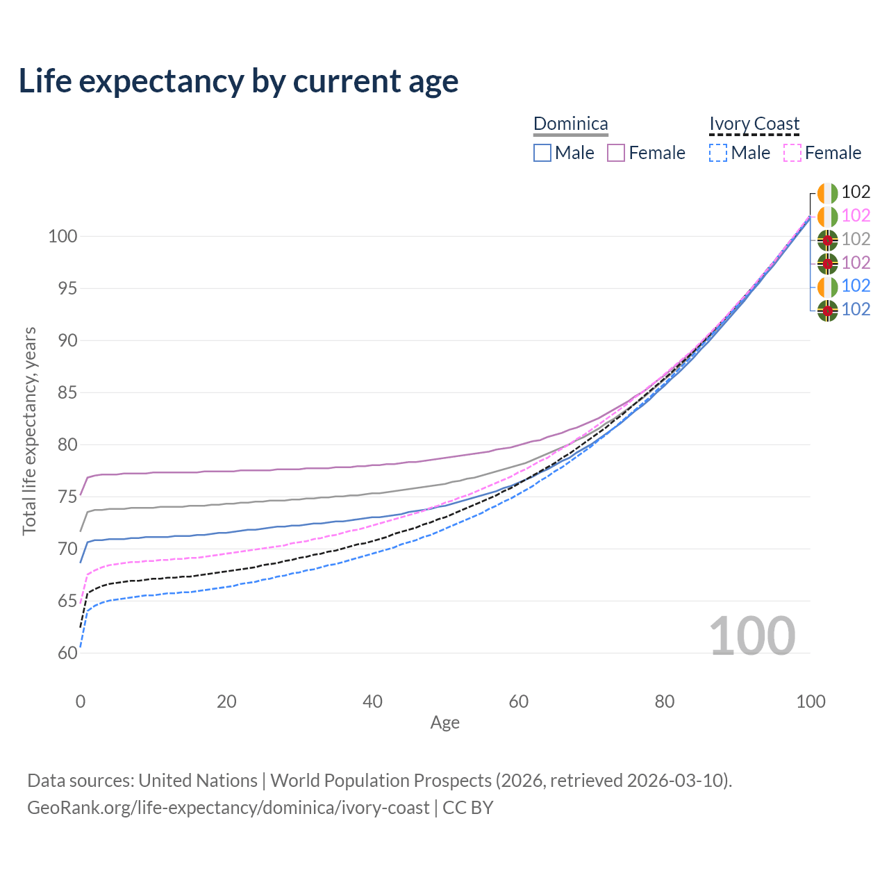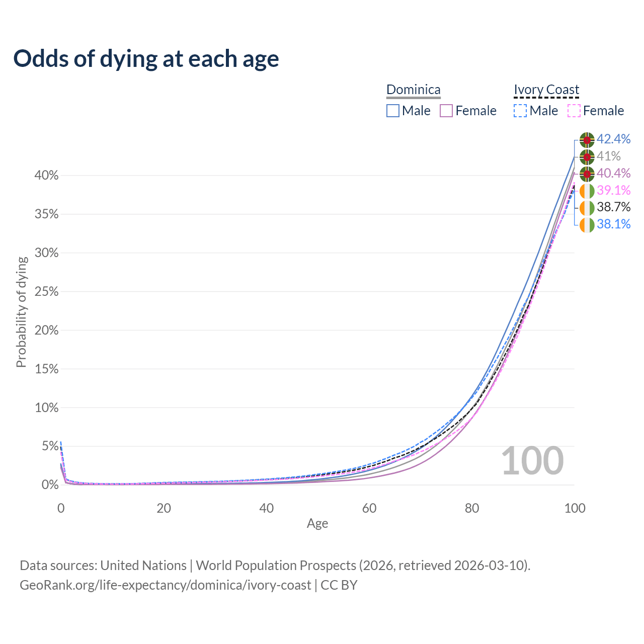 This life expectancy calculator shows the odds of living to 100, 95, 90, and below based on current age for both males and females in Dominica and Ivory Coast, along with mean and median age of death. The calculations are based on the 2026 life tables (actuarial tables) from the UN World Population Prospects.