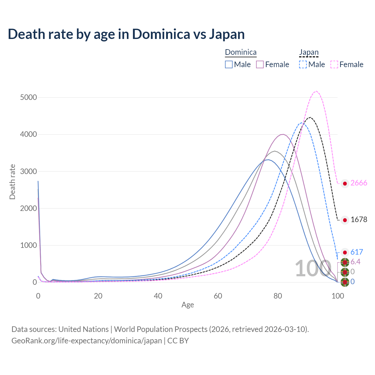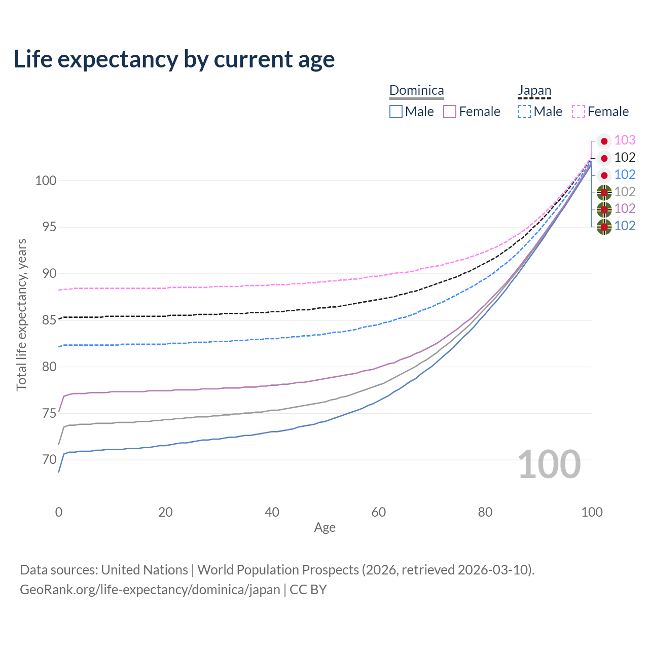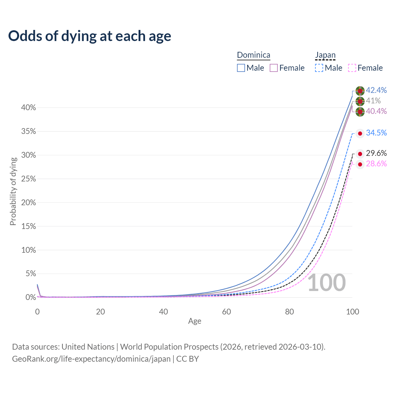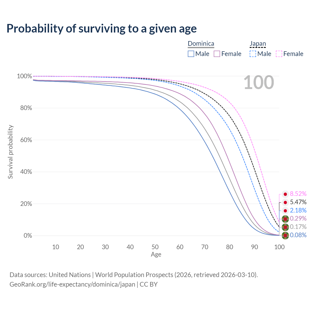 This life expectancy calculator shows the odds of living to 100, 95, 90, and below based on current age for both males and females in Dominica and Japan, along with mean and median age of death. The calculations are based on the 2026 life tables (actuarial tables) from the UN World Population Prospects.