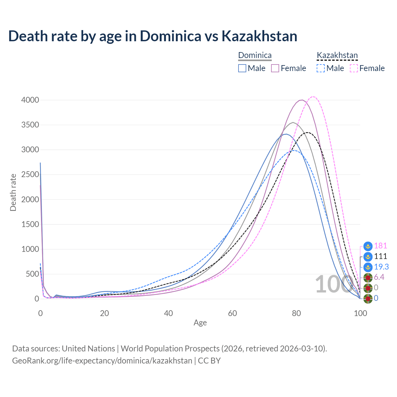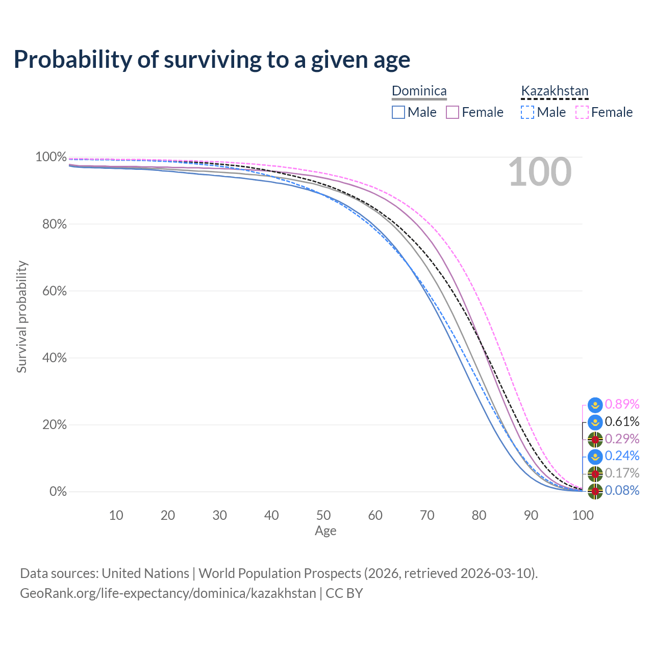 This life expectancy calculator shows the odds of living to 100, 95, 90, and below based on current age for both males and females in Dominica and Kazakhstan, along with mean and median age of death. The calculations are based on the 2026 life tables (actuarial tables) from the UN World Population Prospects.