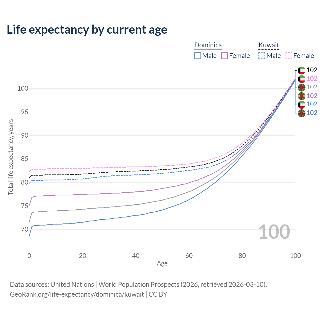 This life expectancy calculator shows the odds of living to 100, 95, 90, and below based on current age for both males and females in Dominica and Kuwait, along with mean and median age of death. The calculations are based on the 2026 life tables (actuarial tables) from the UN World Population Prospects.