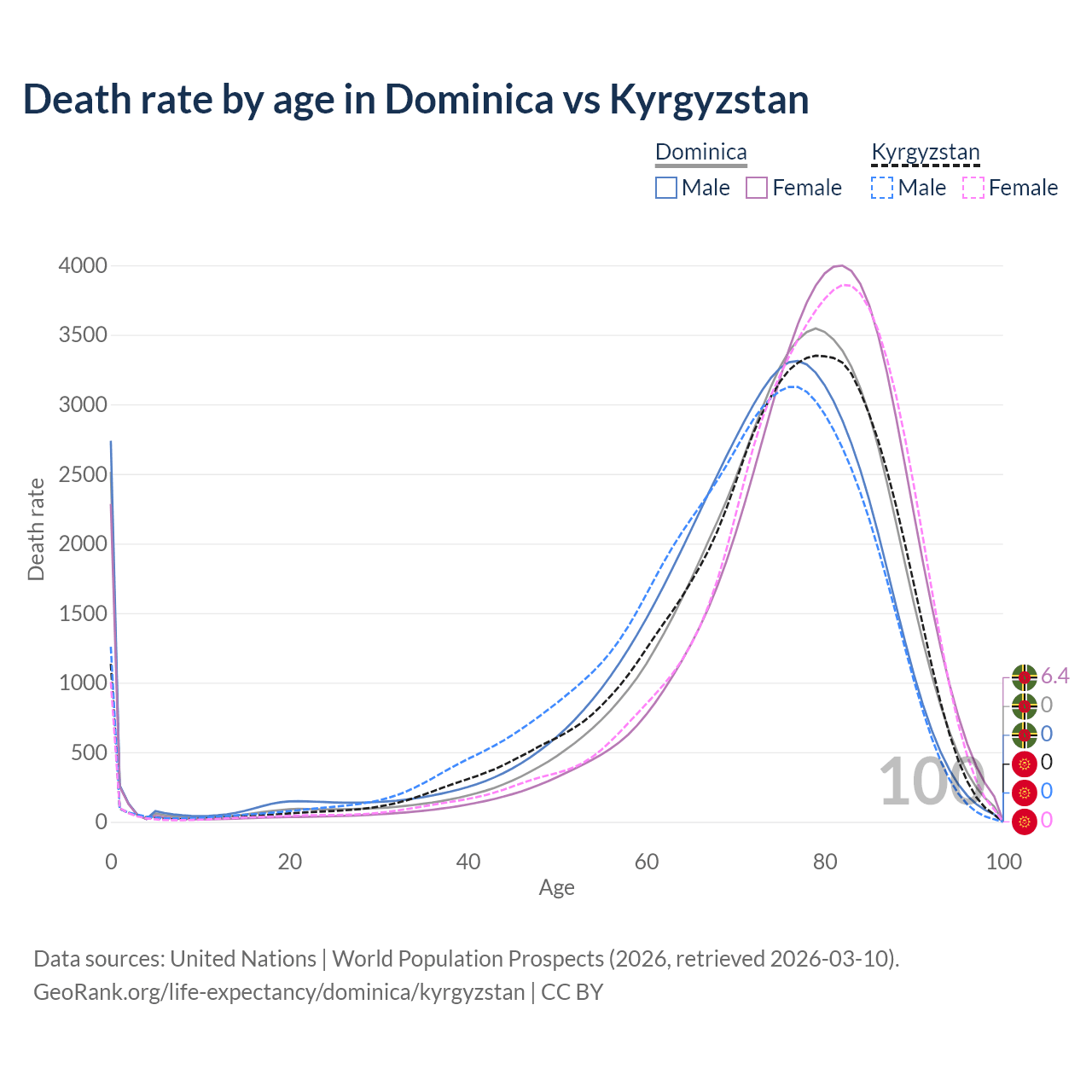 In Dominica, the most common age of death is 79, compared to 79 in Kyrgyzstan. The median age of death is 75.9 in Dominica and 75.6 in Kyrgyzstan, meaning only half of each cohort is expected to live past that age.