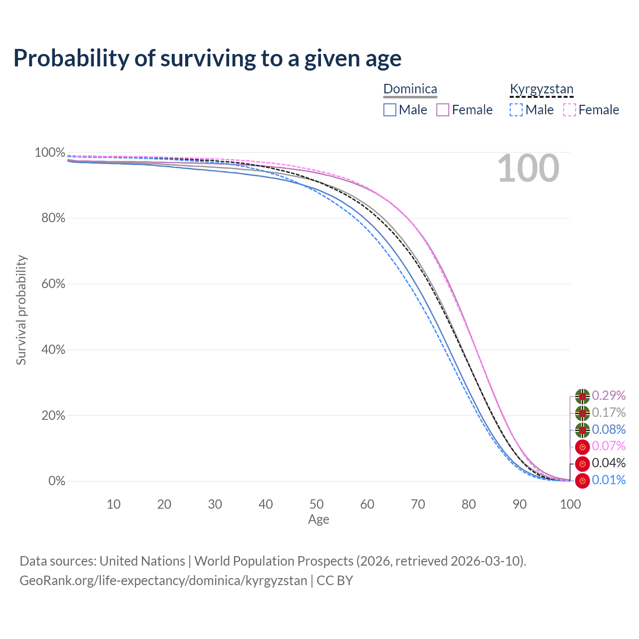 This life expectancy calculator shows the odds of living to 100, 95, 90, and below based on current age for both males and females in Dominica and Kyrgyzstan, along with mean and median age of death. The calculations are based on the 2026 life tables (actuarial tables) from the UN World Population Prospects.