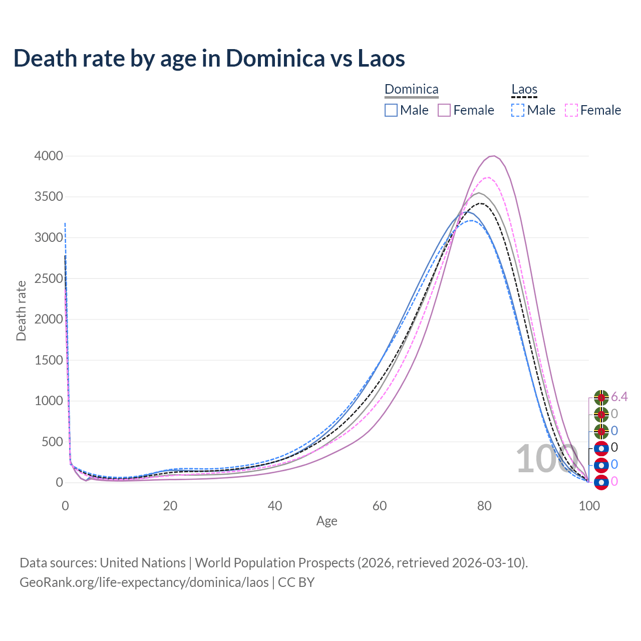 In Dominica, the most common age of death is 79, compared to 79 in Laos. The median age of death is 75.9 in Dominica and 74.7 in Laos, meaning only half of each cohort is expected to live past that age.