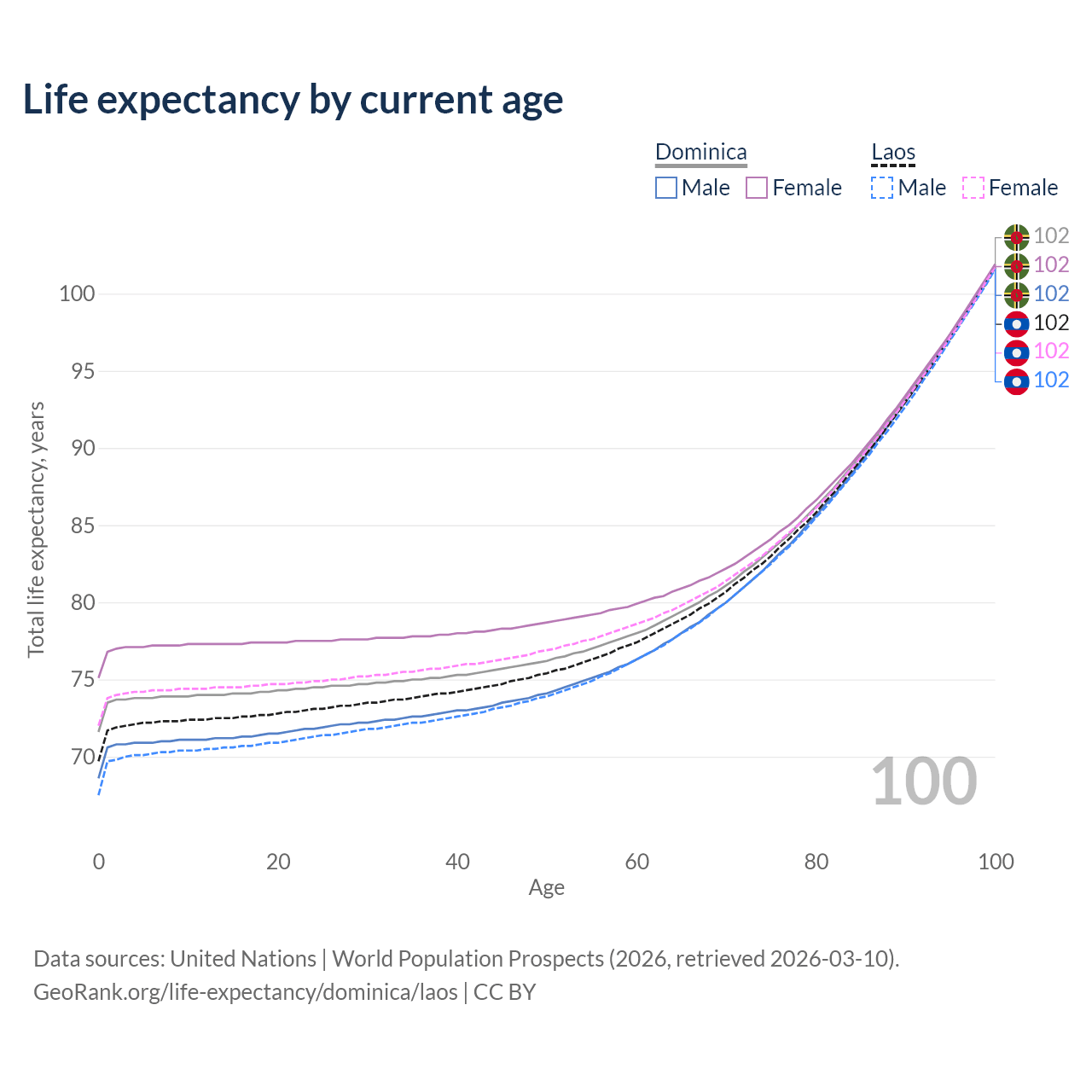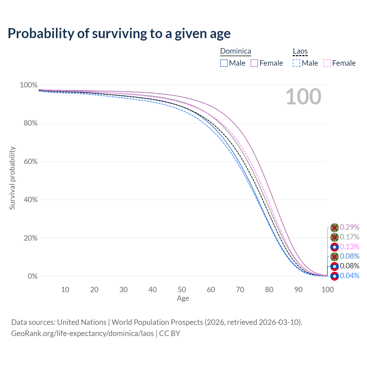 This life expectancy calculator shows the odds of living to 100, 95, 90, and below based on current age for both males and females in Dominica and Laos, along with mean and median age of death. The calculations are based on the 2026 life tables (actuarial tables) from the UN World Population Prospects.