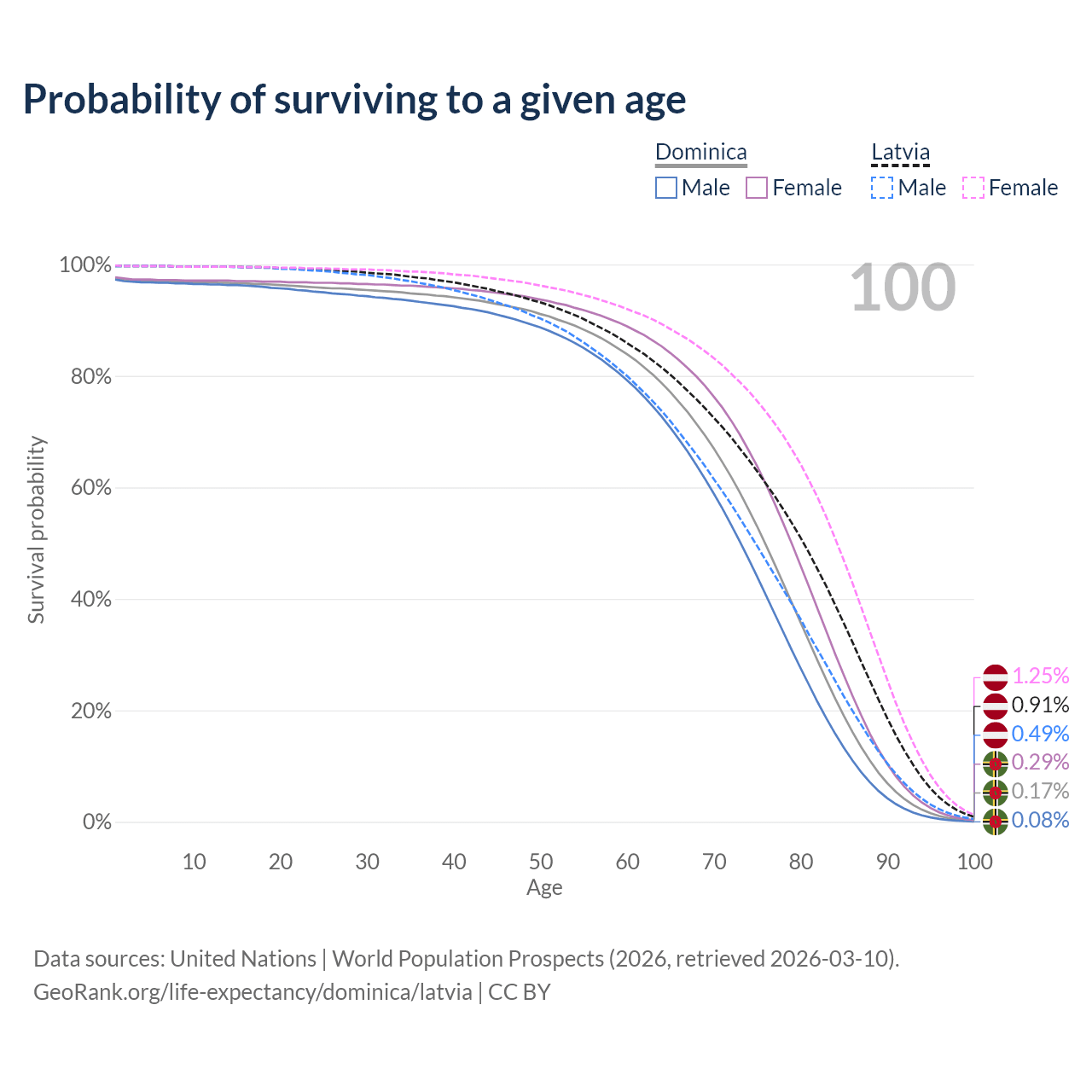 This life expectancy calculator shows the odds of living to 100, 95, 90, and below based on current age for both males and females in Dominica and Latvia, along with mean and median age of death. The calculations are based on the 2026 life tables (actuarial tables) from the UN World Population Prospects.