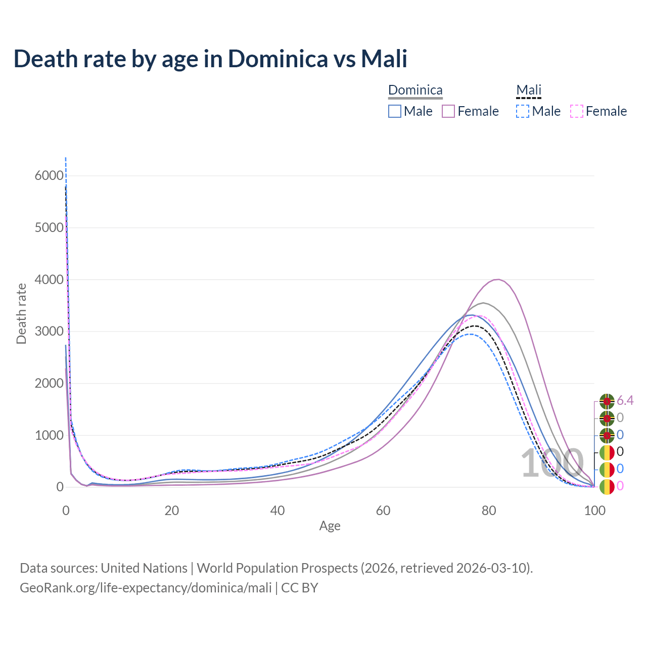 In Dominica, the most common age of death is 79, compared to 0 in Mali. The median age of death is 75.9 in Dominica and 70.2 in Mali, meaning only half of each cohort is expected to live past that age.