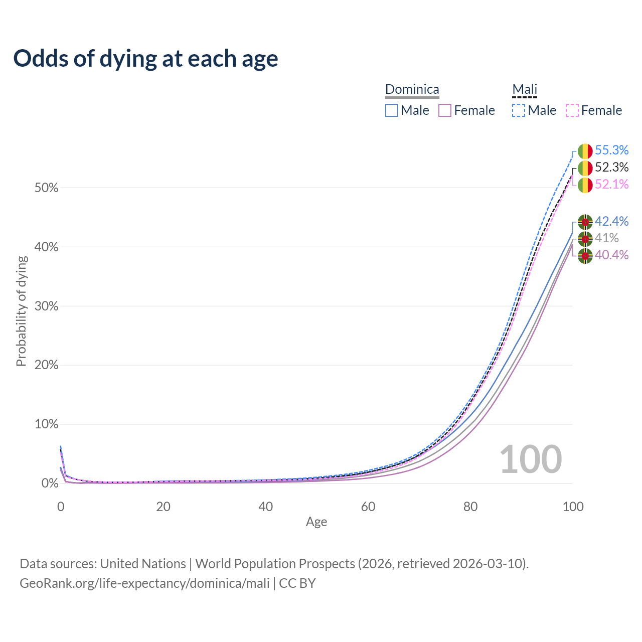 This life expectancy calculator shows the odds of living to 100, 95, 90, and below based on current age for both males and females in Dominica and Mali, along with mean and median age of death. The calculations are based on the 2026 life tables (actuarial tables) from the UN World Population Prospects.