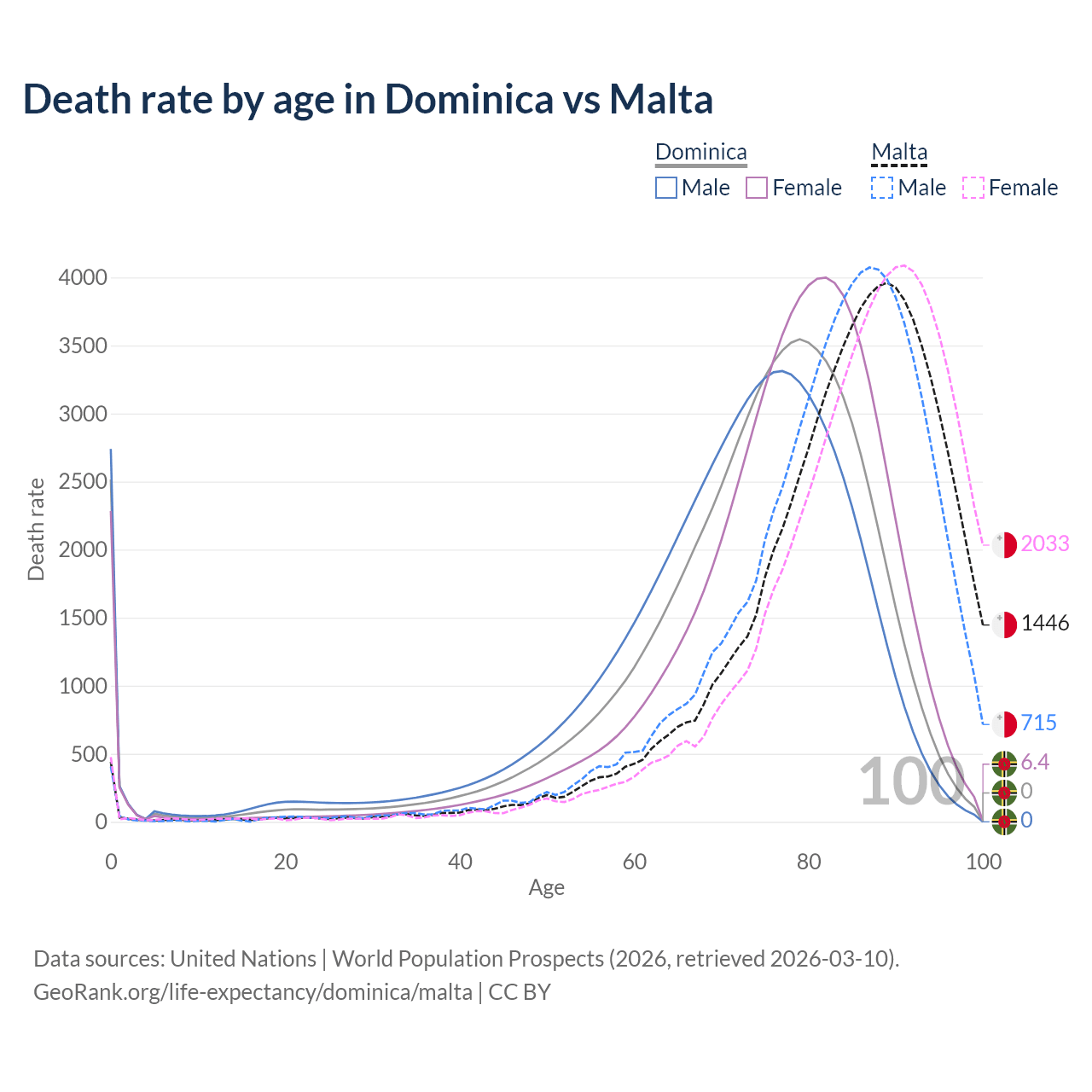 This life expectancy calculator shows the odds of living to 100, 95, 90, and below based on current age for both males and females in Dominica and Malta, along with mean and median age of death. The calculations are based on the 2026 life tables (actuarial tables) from the UN World Population Prospects.