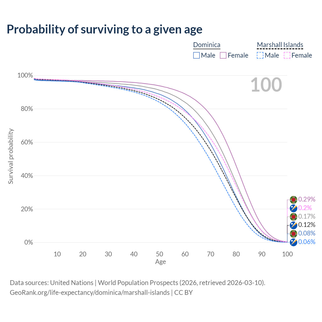 This life expectancy calculator shows the odds of living to 100, 95, 90, and below based on current age for both males and females in Dominica and the Marshall Islands, along with mean and median age of death. The calculations are based on the 2026 life tables (actuarial tables) from the UN World Population Prospects.