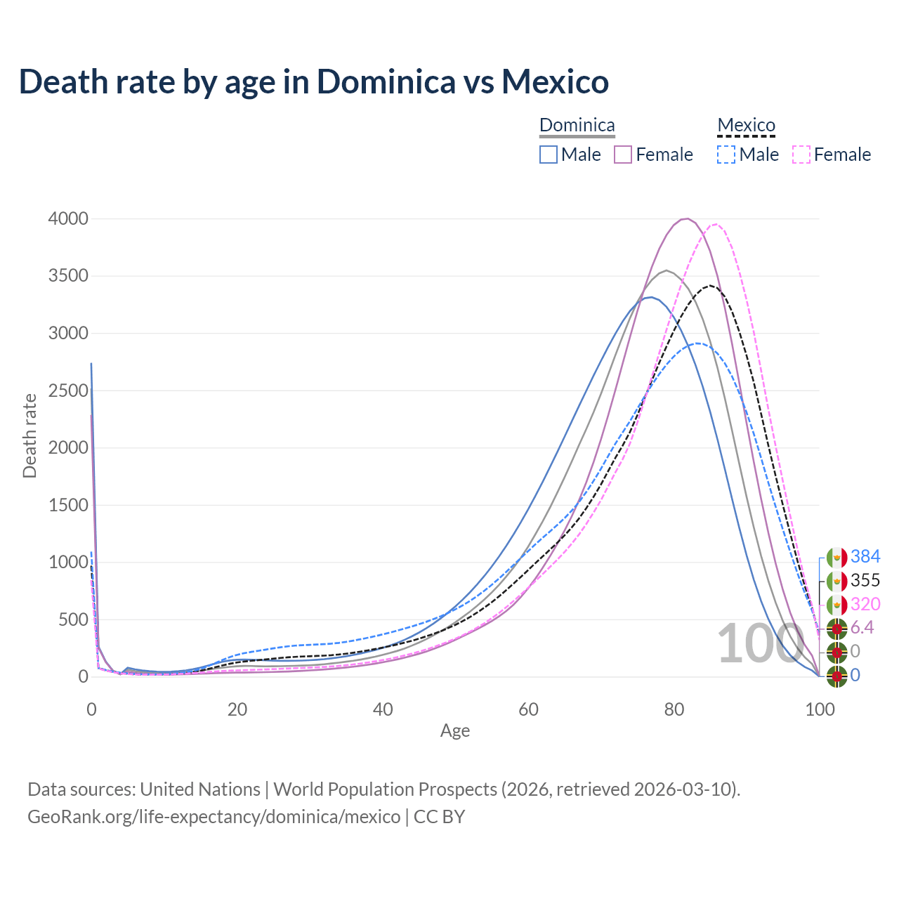 In Dominica, the most common age of death is 79, compared to 85 in Mexico. The median age of death is 75.9 in Dominica and 80.1 in Mexico, meaning only half of each cohort is expected to live past that age.