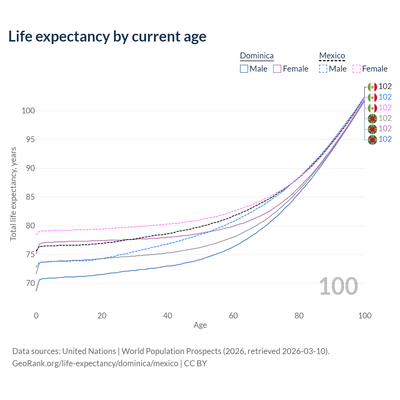 This life expectancy calculator shows the odds of living to 100, 95, 90, and below based on current age for both males and females in Dominica and Mexico, along with mean and median age of death. The calculations are based on the 2026 life tables (actuarial tables) from the UN World Population Prospects.