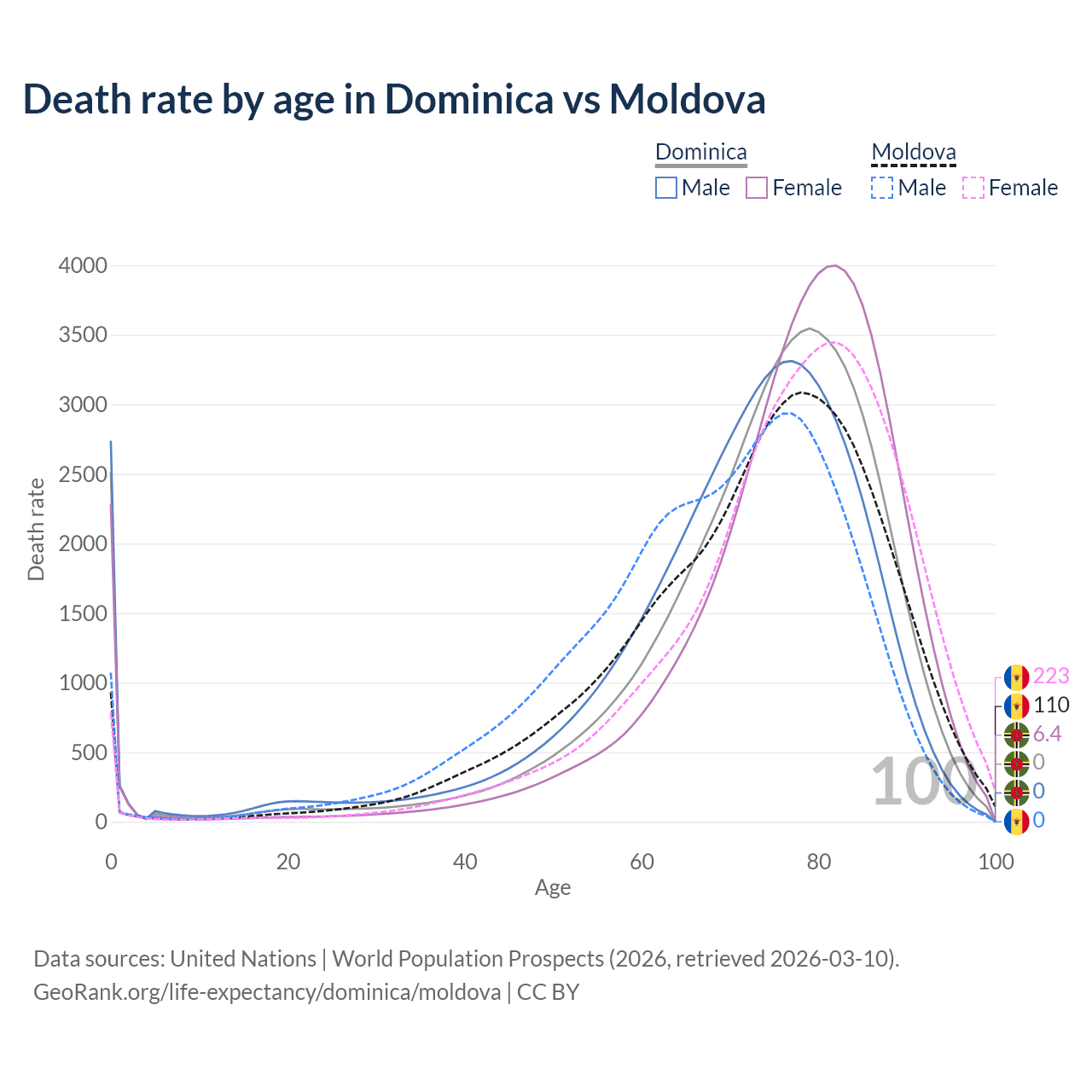 This life expectancy calculator shows the odds of living to 100, 95, 90, and below based on current age for both males and females in Dominica and Moldova, along with mean and median age of death. The calculations are based on the 2026 life tables (actuarial tables) from the UN World Population Prospects.