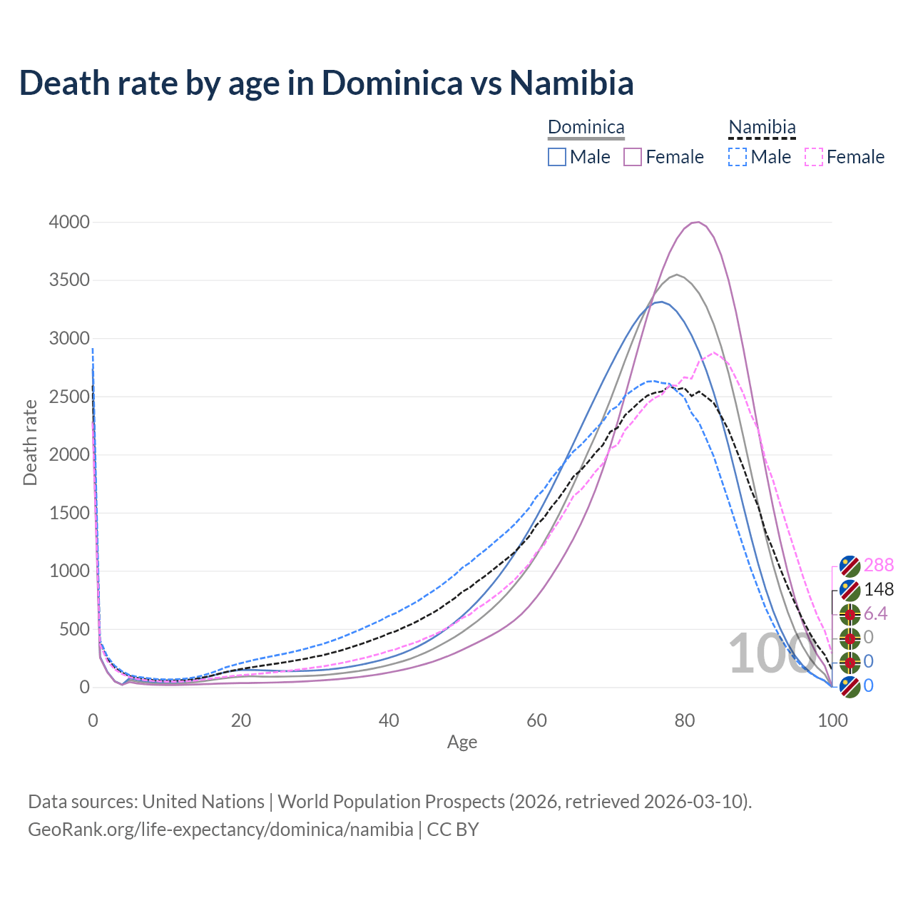 In Dominica, the most common age of death is 79, compared to 0 in Namibia. The median age of death is 75.9 in Dominica and 72.7 in Namibia, meaning only half of each cohort is expected to live past that age.