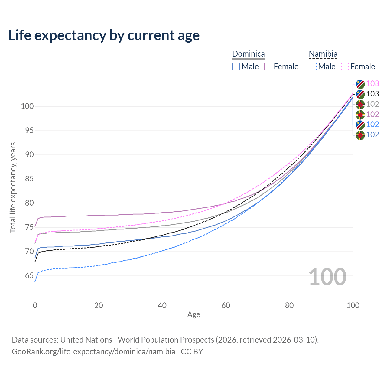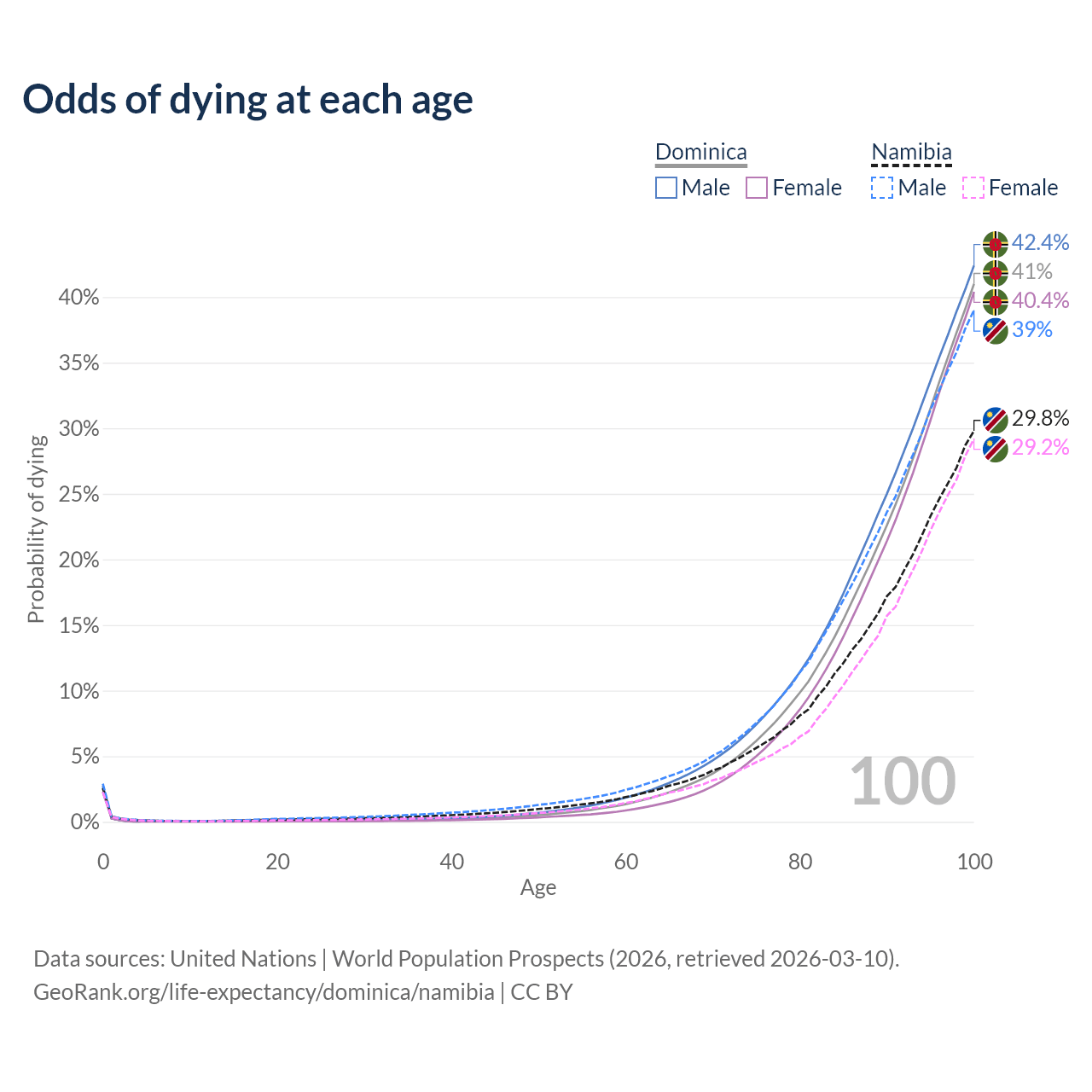 This life expectancy calculator shows the odds of living to 100, 95, 90, and below based on current age for both males and females in Dominica and Namibia, along with mean and median age of death. The calculations are based on the 2026 life tables (actuarial tables) from the UN World Population Prospects.