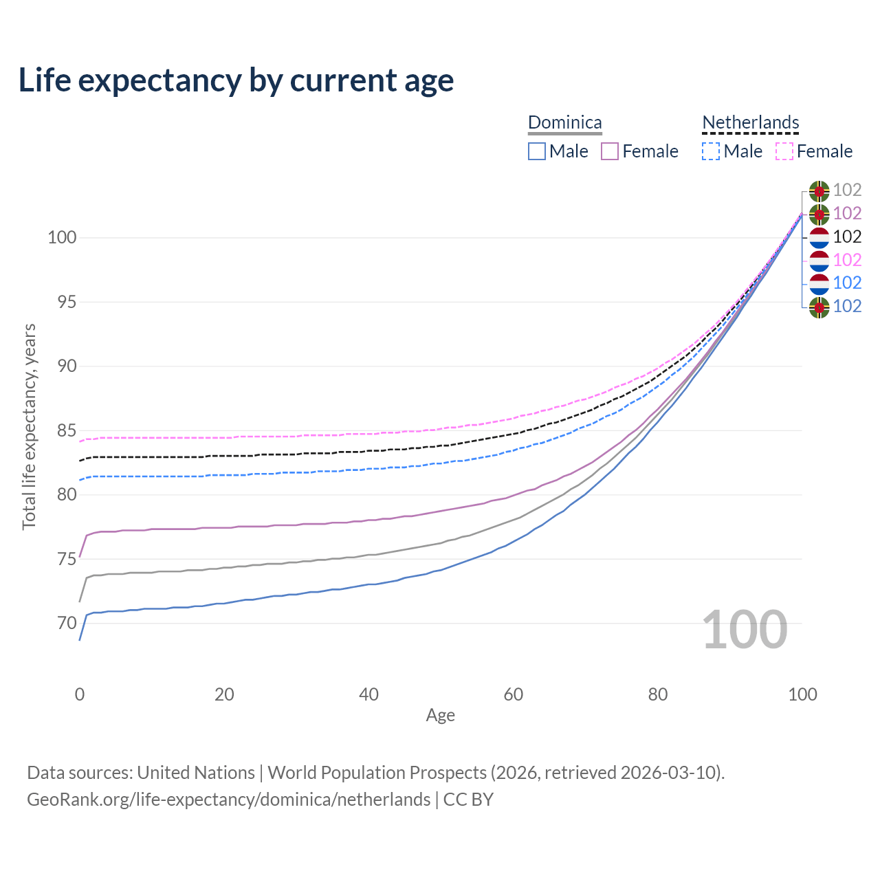 This life expectancy calculator shows the odds of living to 100, 95, 90, and below based on current age for both males and females in Dominica and the Netherlands, along with mean and median age of death. The calculations are based on the 2026 life tables (actuarial tables) from the UN World Population Prospects.