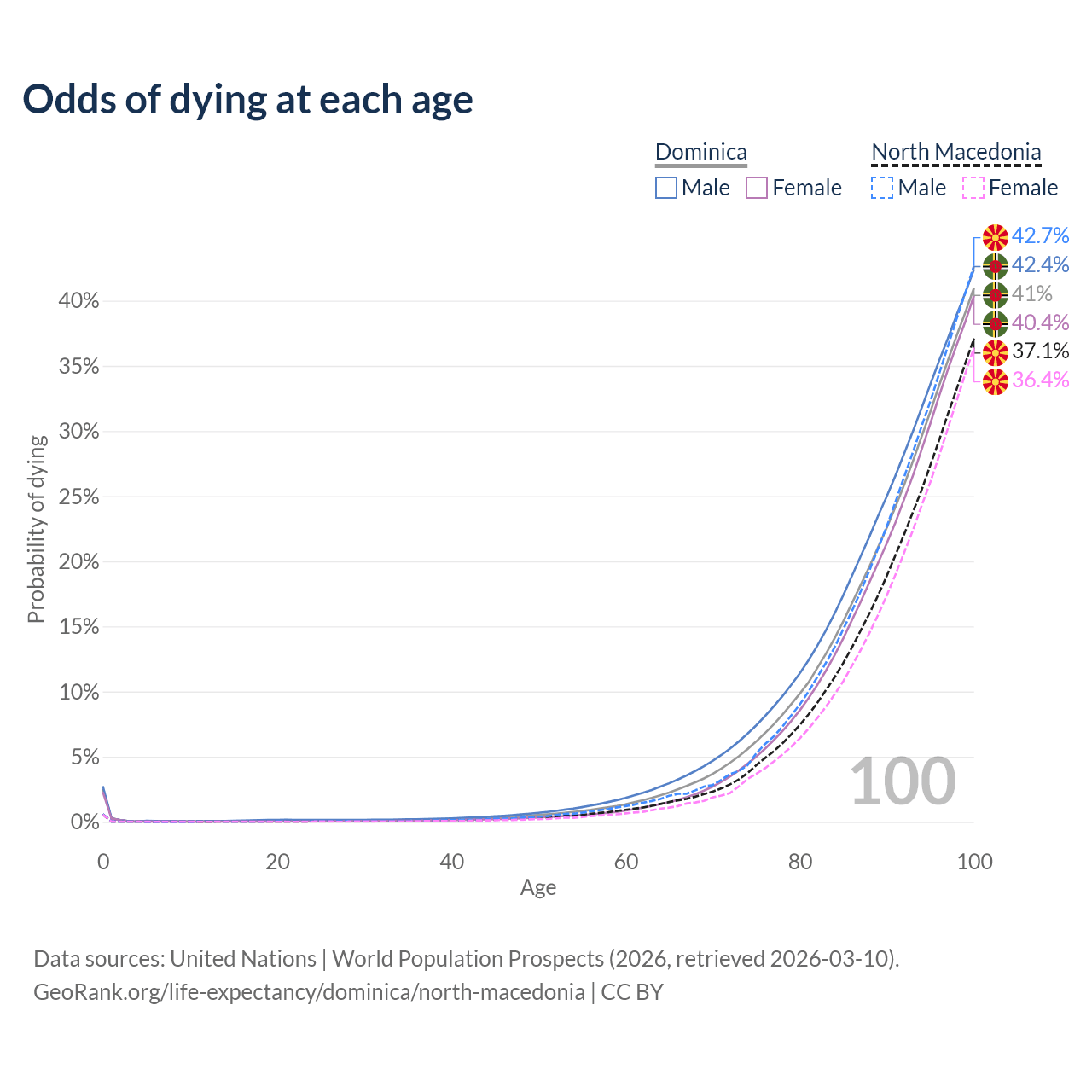 This life expectancy calculator shows the odds of living to 100, 95, 90, and below based on current age for both males and females in Dominica and North Macedonia, along with mean and median age of death. The calculations are based on the 2026 life tables (actuarial tables) from the UN World Population Prospects.