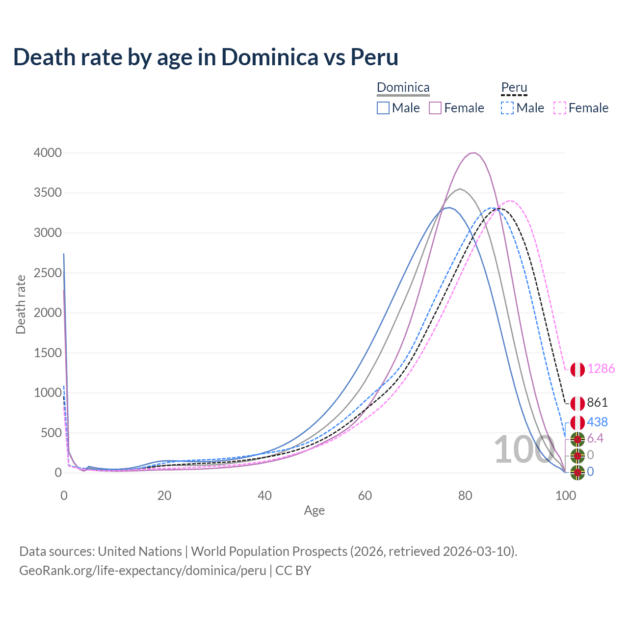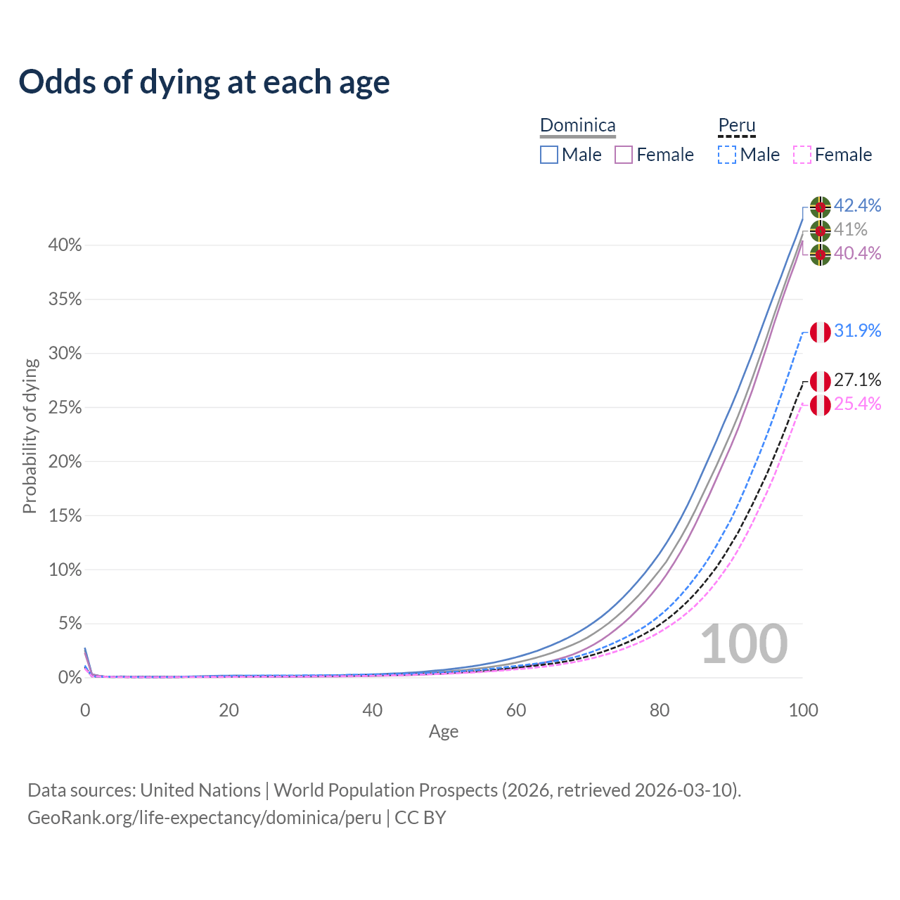 This life expectancy calculator shows the odds of living to 100, 95, 90, and below based on current age for both males and females in Dominica and Peru, along with mean and median age of death. The calculations are based on the 2026 life tables (actuarial tables) from the UN World Population Prospects.