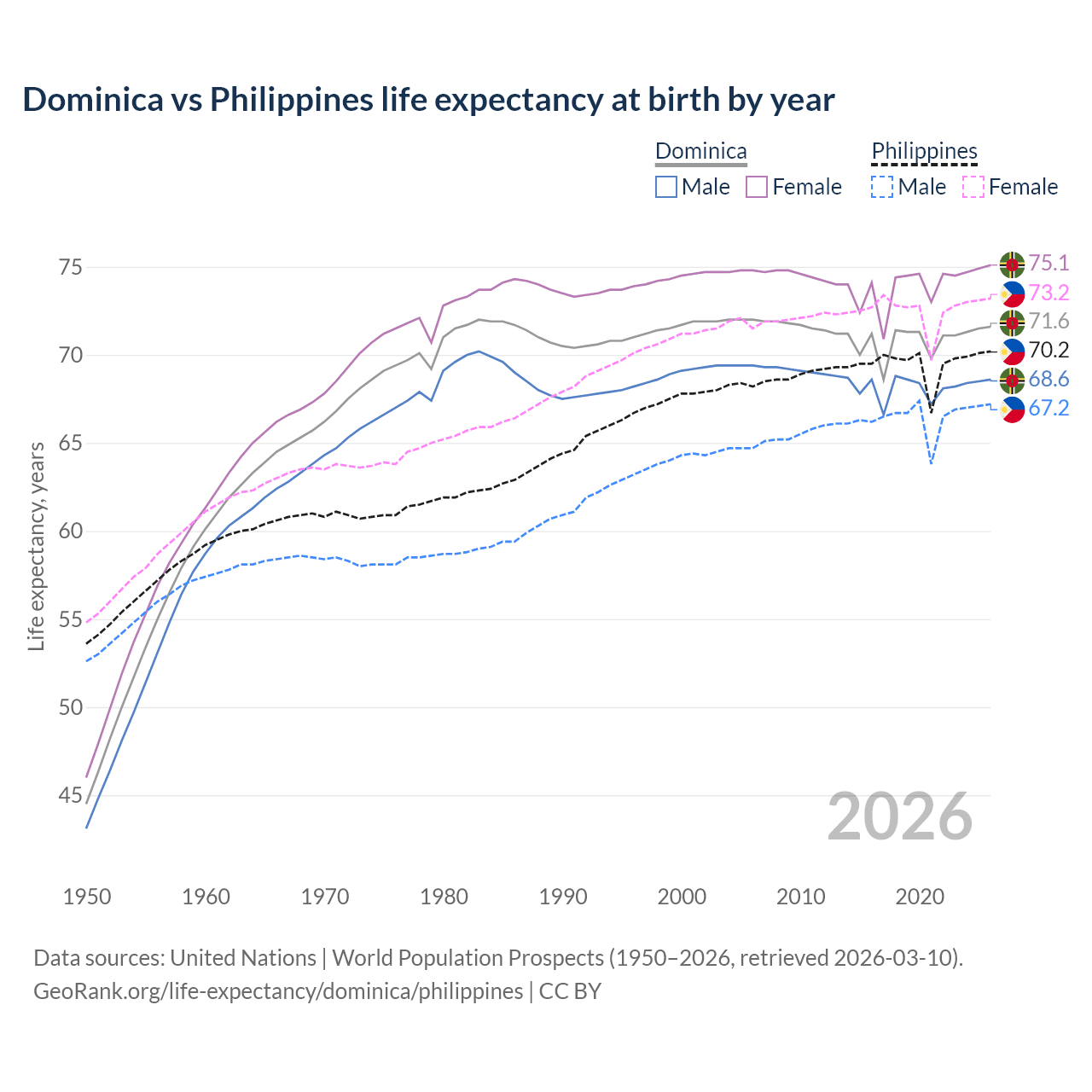 The average life expectancy at birth is 71.6 years in Dominica vs 70.2 in the Philippines. Dominica is ranked 128/197 by life expectancy, and the Philippines is 137/197. In Dominica, the life expectancy is 68.6 years for males and 75.1 years for females. In the Philippines, it's 67.2 years for males and 73.2 years for females.