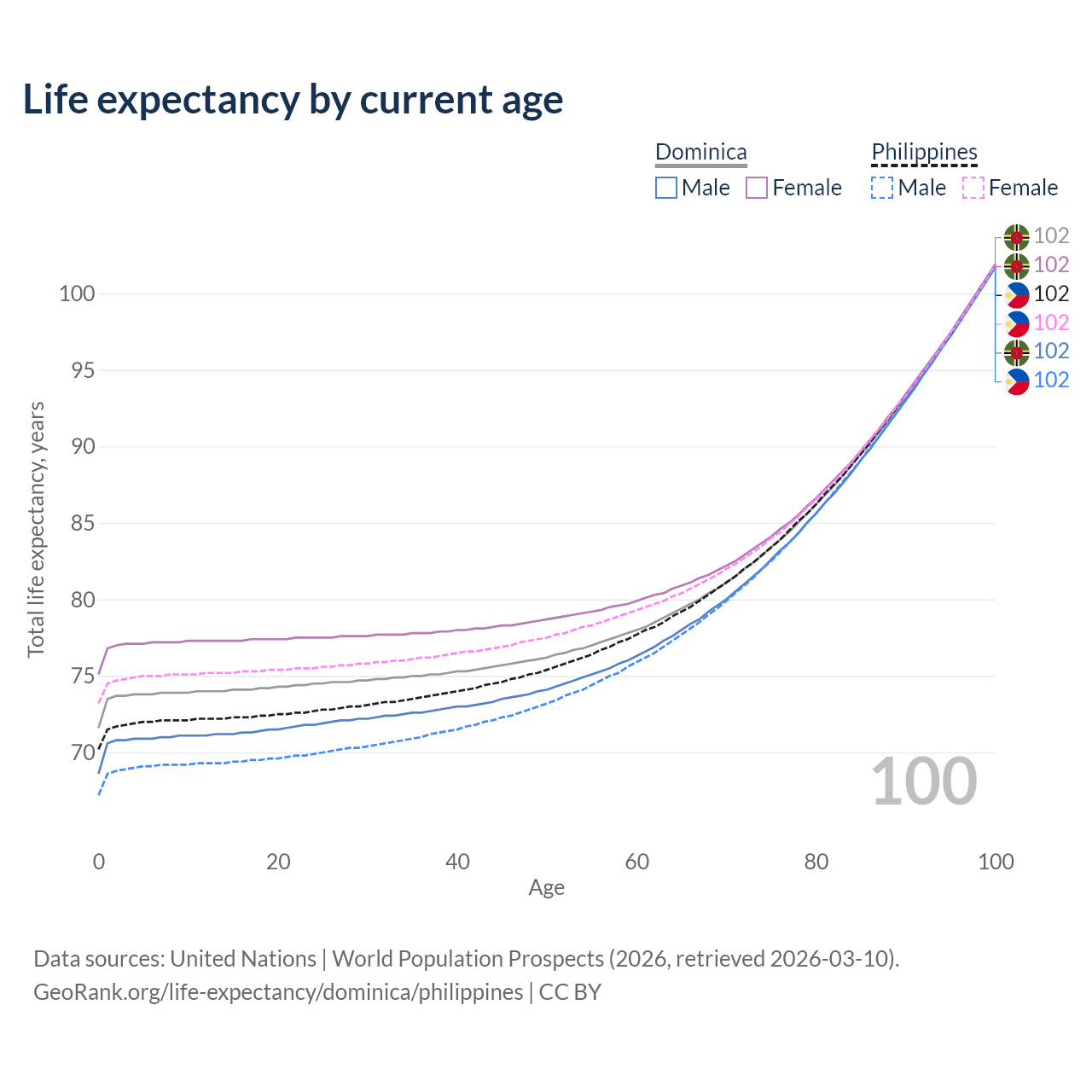 This life expectancy calculator shows the odds of living to 100, 95, 90, and below based on current age for both males and females in Dominica and the Philippines, along with mean and median age of death. The calculations are based on the 2026 life tables (actuarial tables) from the UN World Population Prospects.