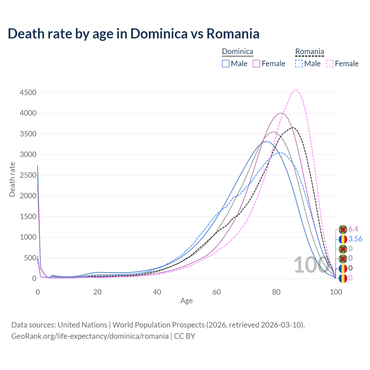 This life expectancy calculator shows the odds of living to 100, 95, 90, and below based on current age for both males and females in Dominica and Romania, along with mean and median age of death. The calculations are based on the 2026 life tables (actuarial tables) from the UN World Population Prospects.
