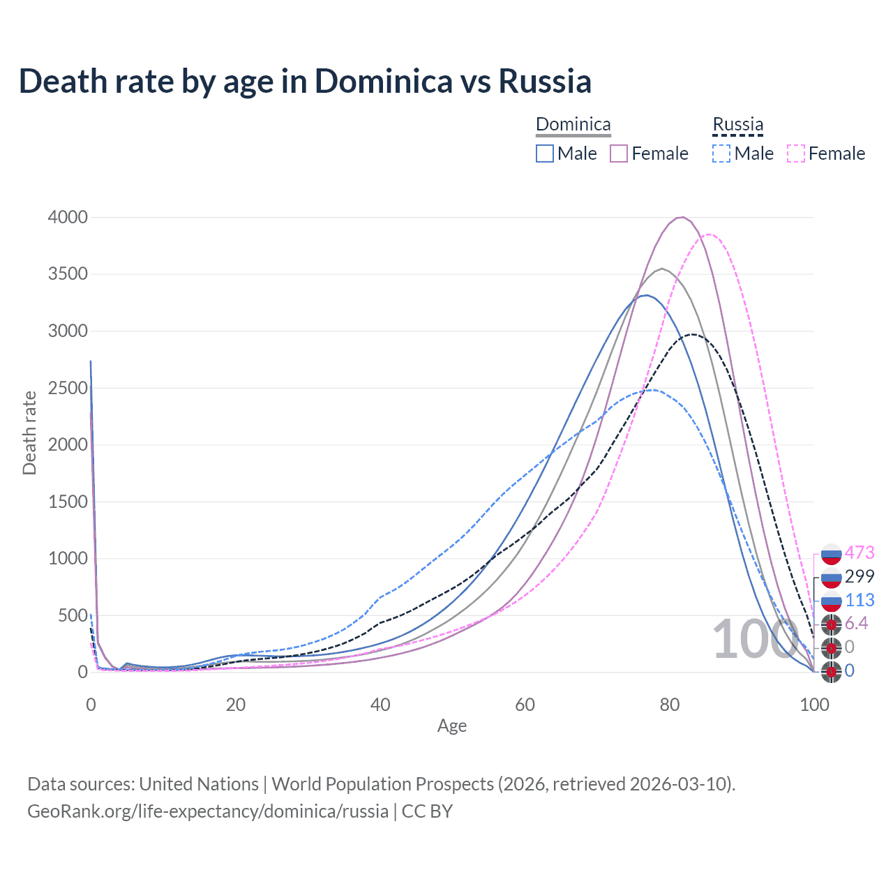 This life expectancy calculator shows the odds of living to 100, 95, 90, and below based on current age for both males and females in Dominica and Russia, along with mean and median age of death. The calculations are based on the 2026 life tables (actuarial tables) from the UN World Population Prospects.