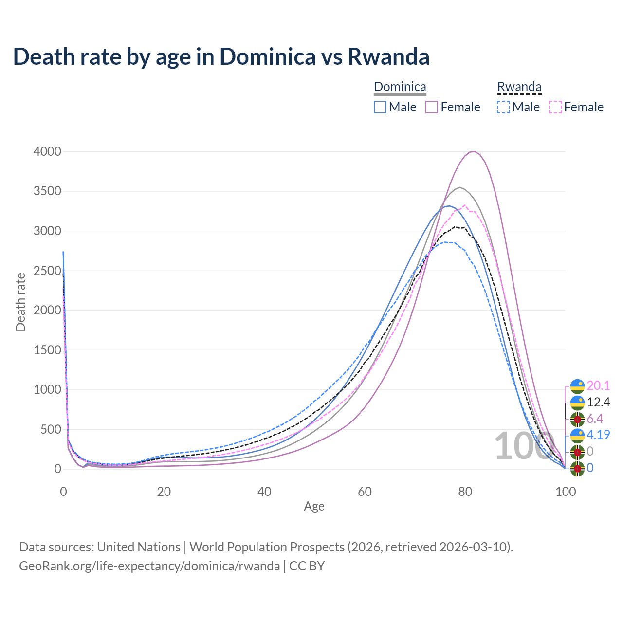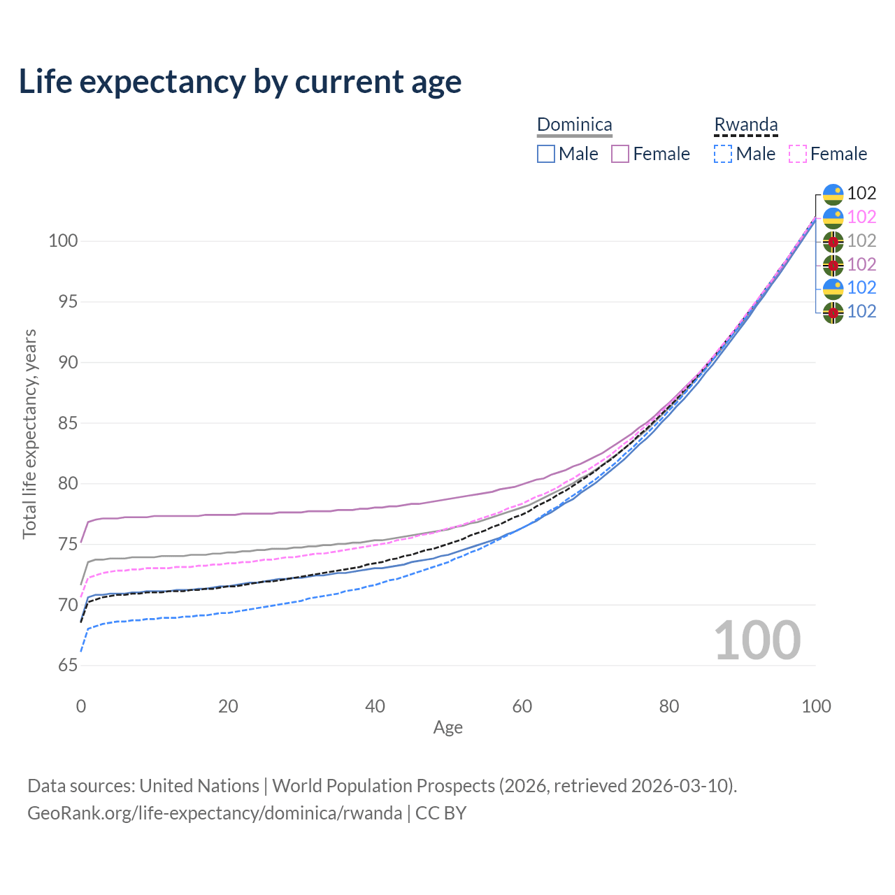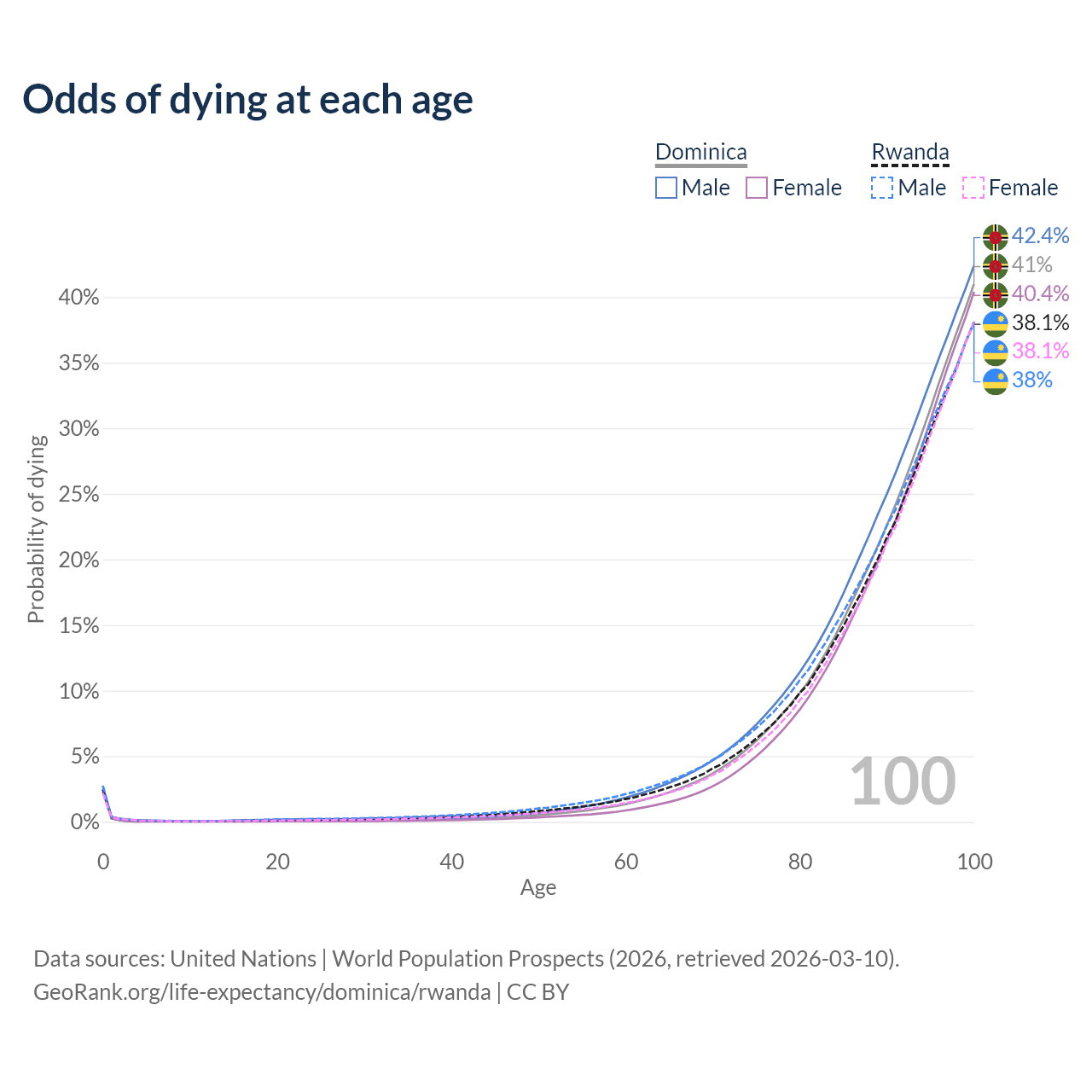 This life expectancy calculator shows the odds of living to 100, 95, 90, and below based on current age for both males and females in Dominica and Rwanda, along with mean and median age of death. The calculations are based on the 2026 life tables (actuarial tables) from the UN World Population Prospects.