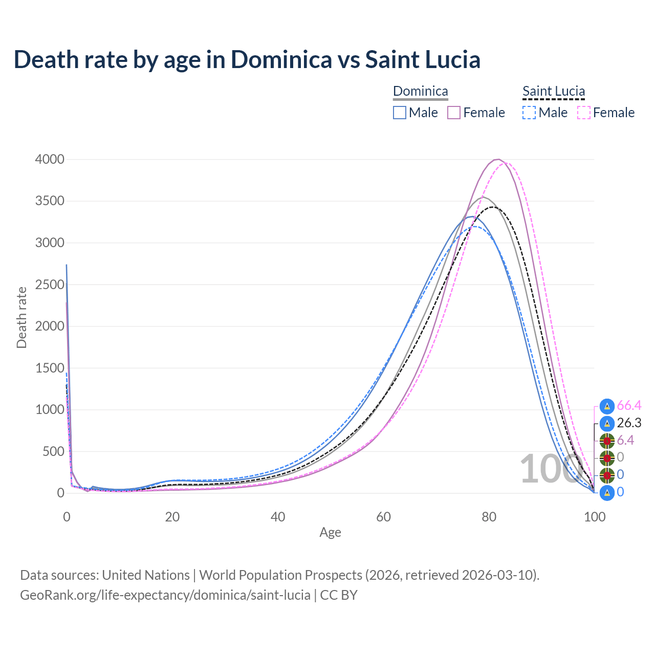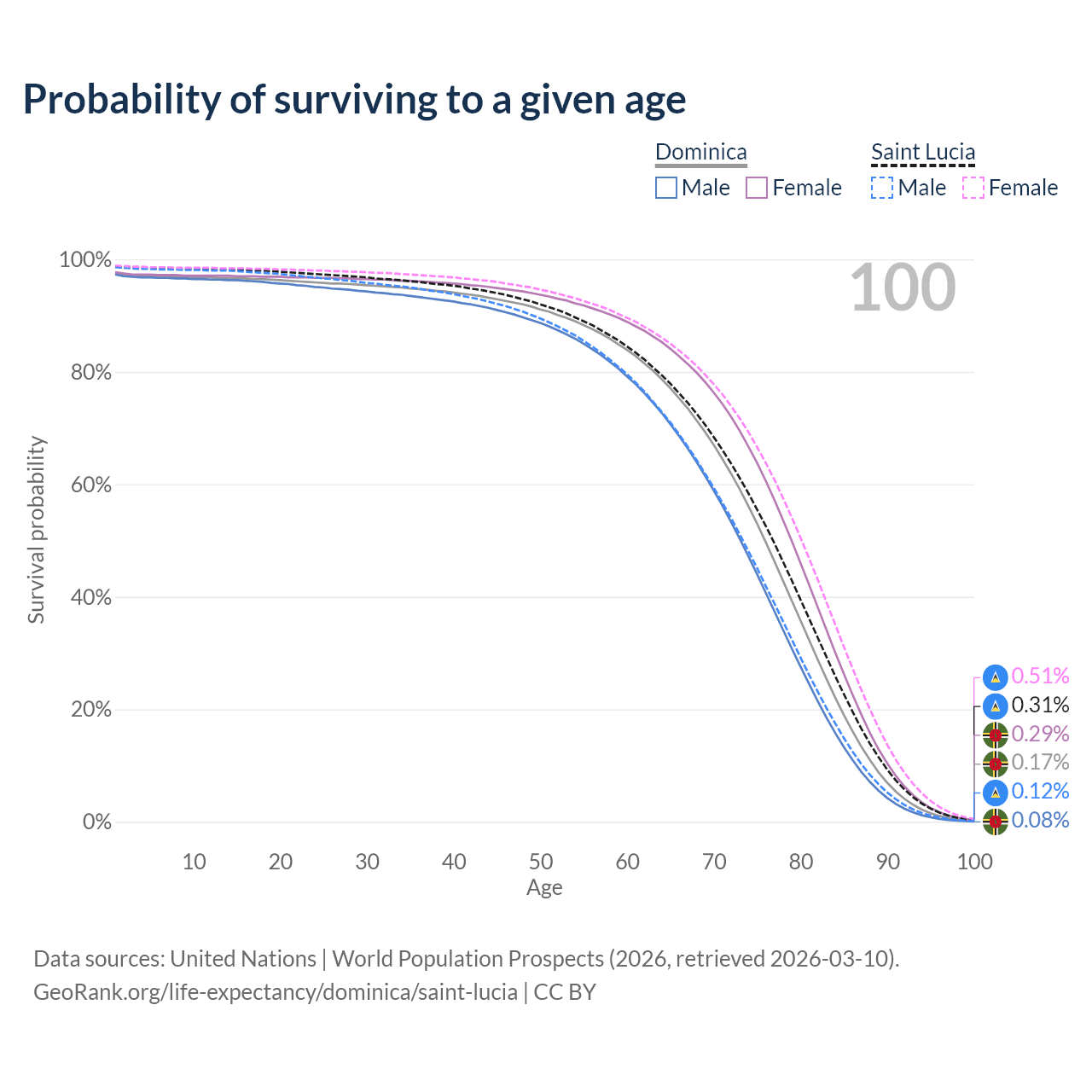 This life expectancy calculator shows the odds of living to 100, 95, 90, and below based on current age for both males and females in Dominica and Saint Lucia, along with mean and median age of death. The calculations are based on the 2026 life tables (actuarial tables) from the UN World Population Prospects.