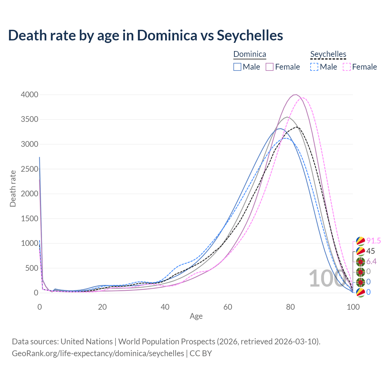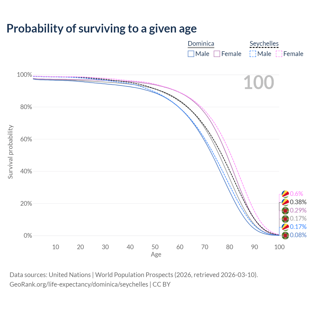This life expectancy calculator shows the odds of living to 100, 95, 90, and below based on current age for both males and females in Dominica and the Seychelles, along with mean and median age of death. The calculations are based on the 2026 life tables (actuarial tables) from the UN World Population Prospects.