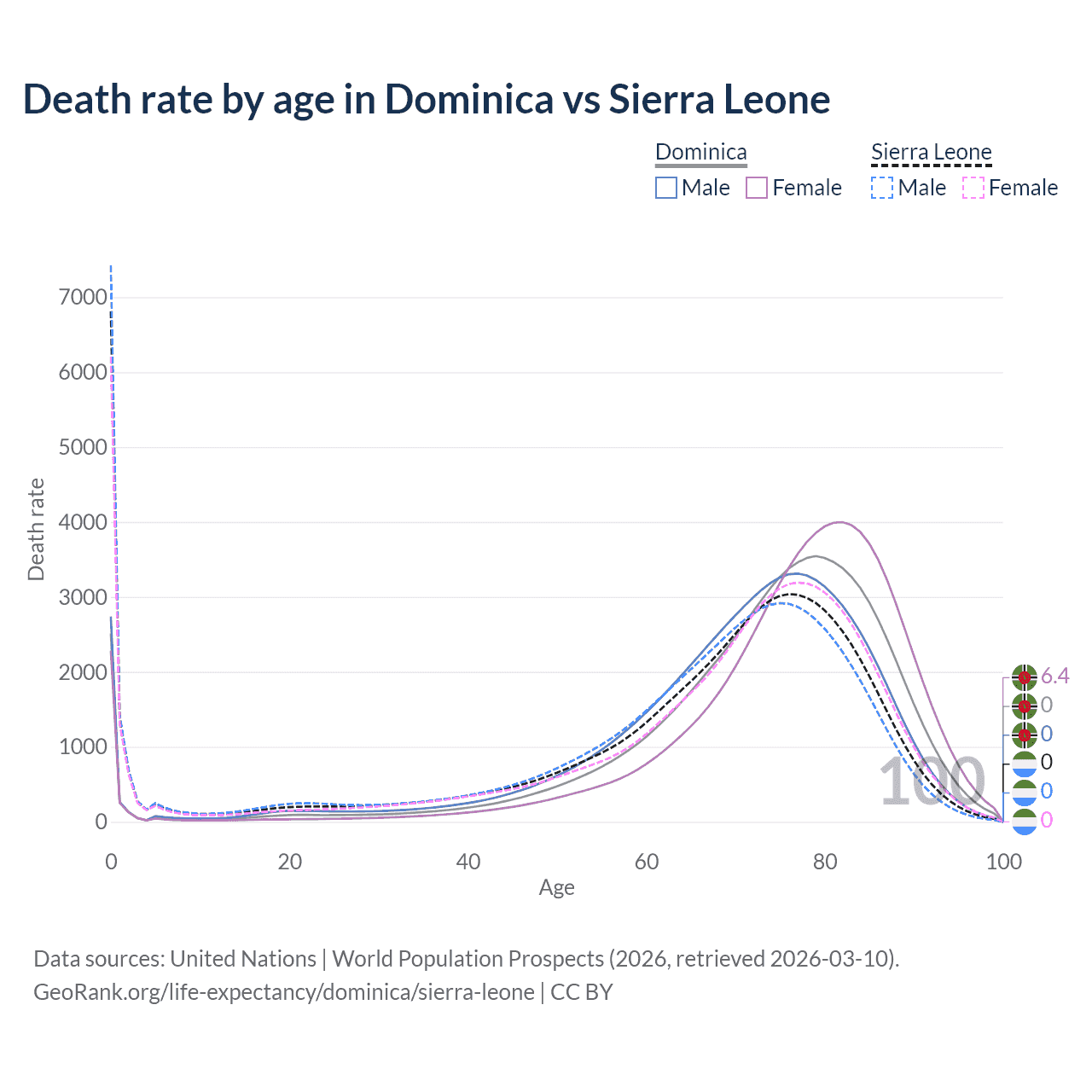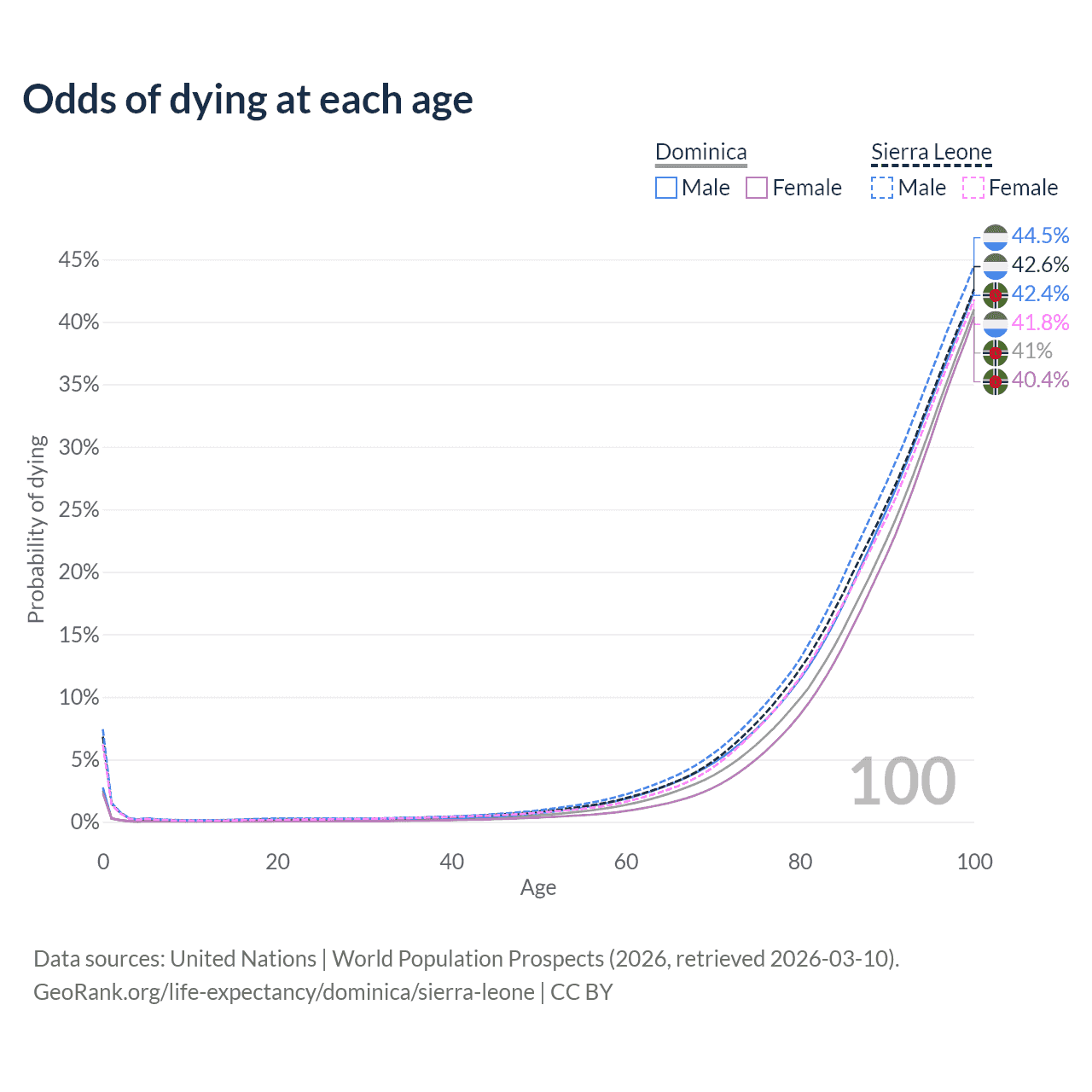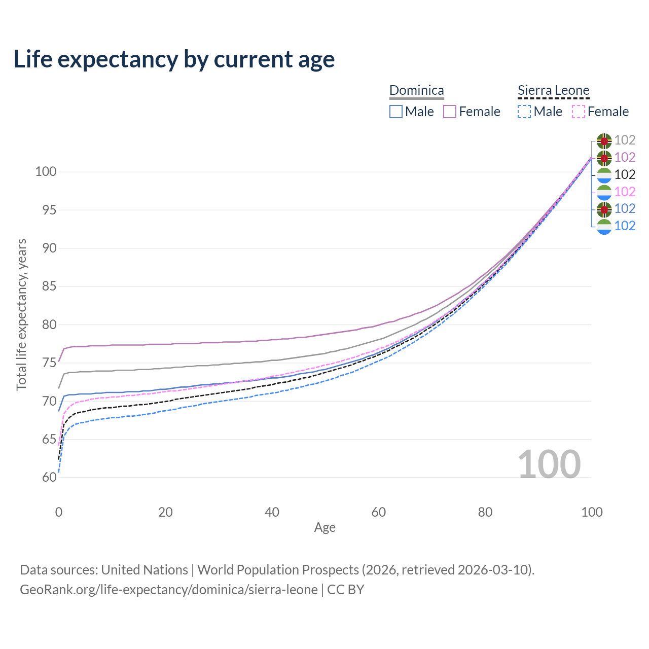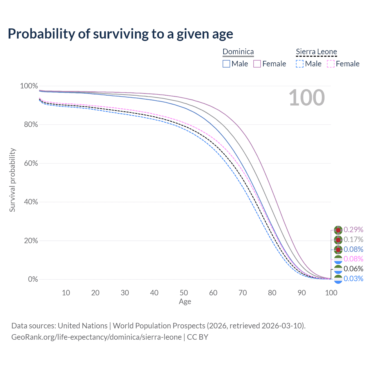This life expectancy calculator shows the odds of living to 100, 95, 90, and below based on current age for both males and females in Dominica and Sierra Leone, along with mean and median age of death. The calculations are based on the 2026 life tables (actuarial tables) from the UN World Population Prospects.