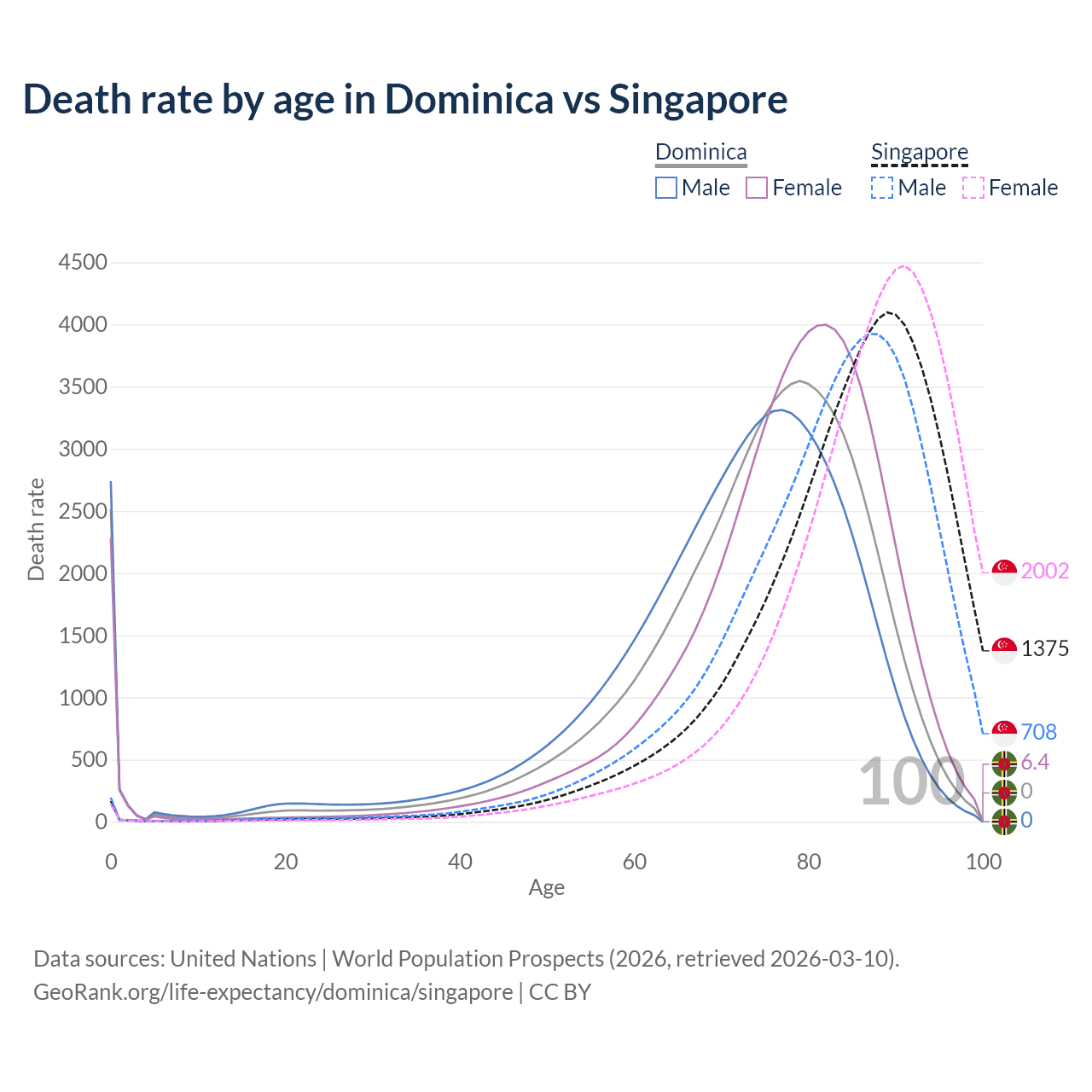 This life expectancy calculator shows the odds of living to 100, 95, 90, and below based on current age for both males and females in Dominica and Singapore, along with mean and median age of death. The calculations are based on the 2026 life tables (actuarial tables) from the UN World Population Prospects.