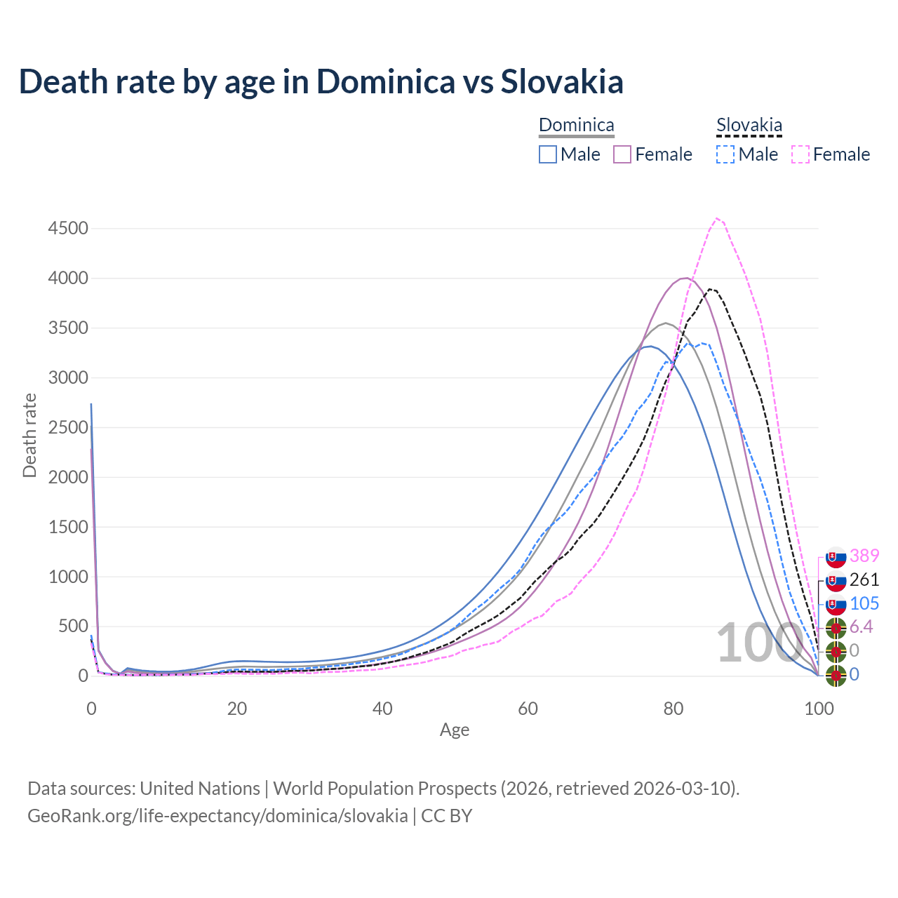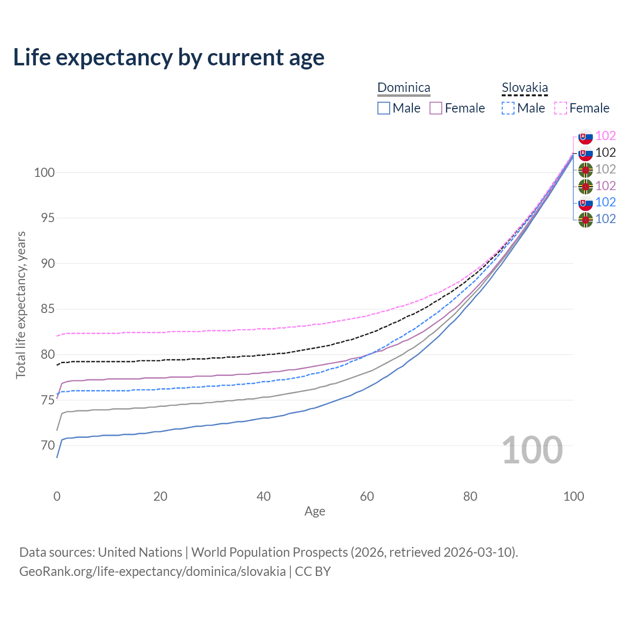 This life expectancy calculator shows the odds of living to 100, 95, 90, and below based on current age for both males and females in Dominica and Slovakia, along with mean and median age of death. The calculations are based on the 2026 life tables (actuarial tables) from the UN World Population Prospects.