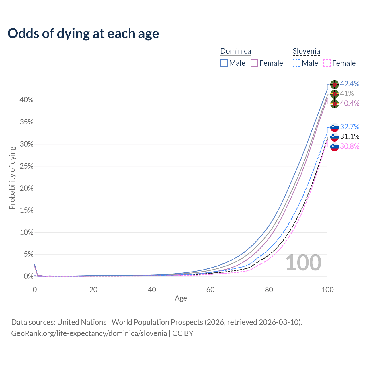 This life expectancy calculator shows the odds of living to 100, 95, 90, and below based on current age for both males and females in Dominica and Slovenia, along with mean and median age of death. The calculations are based on the 2026 life tables (actuarial tables) from the UN World Population Prospects.