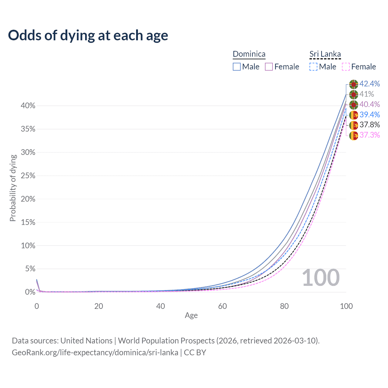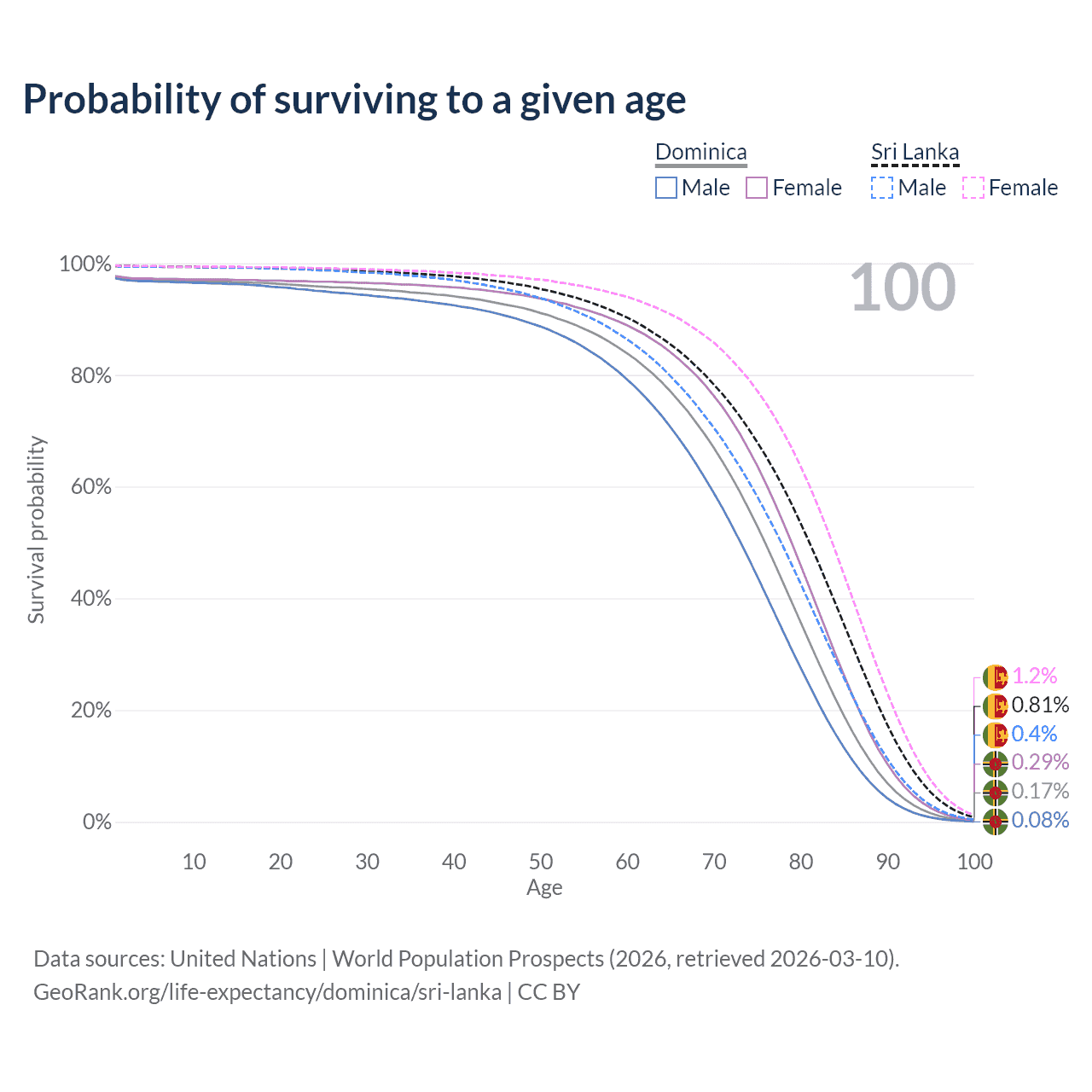 This life expectancy calculator shows the odds of living to 100, 95, 90, and below based on current age for both males and females in Dominica and Sri Lanka, along with mean and median age of death. The calculations are based on the 2026 life tables (actuarial tables) from the UN World Population Prospects.