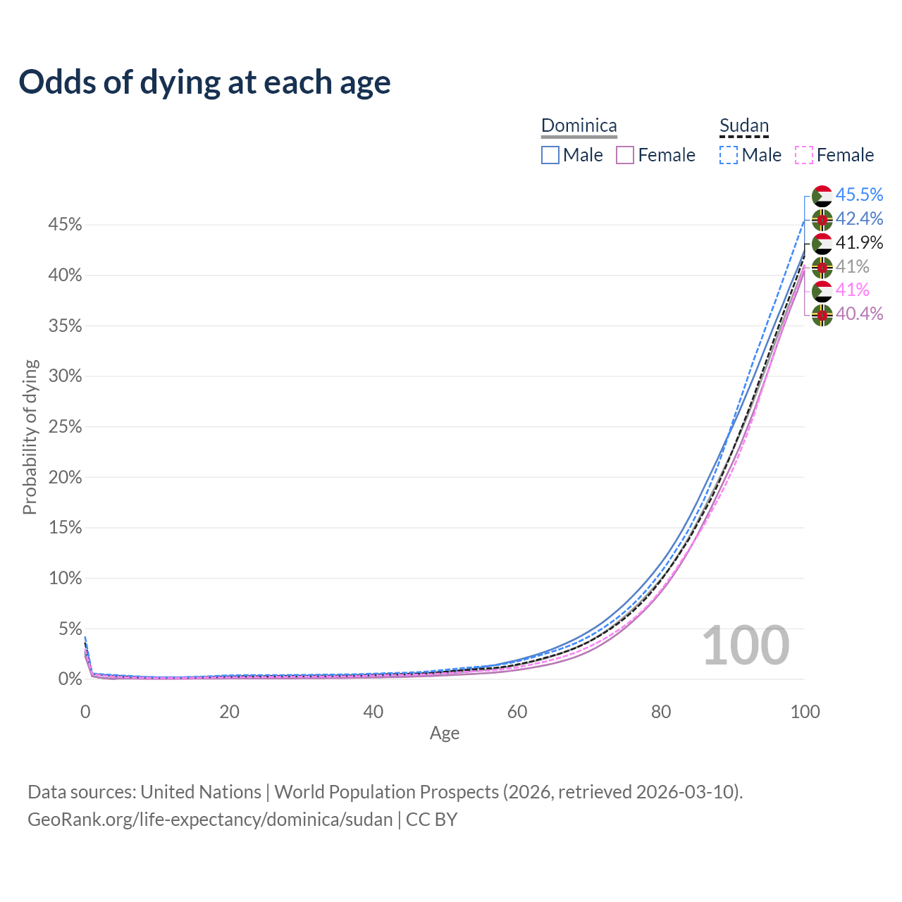 This life expectancy calculator shows the odds of living to 100, 95, 90, and below based on current age for both males and females in Dominica and Sudan, along with mean and median age of death. The calculations are based on the 2026 life tables (actuarial tables) from the UN World Population Prospects.