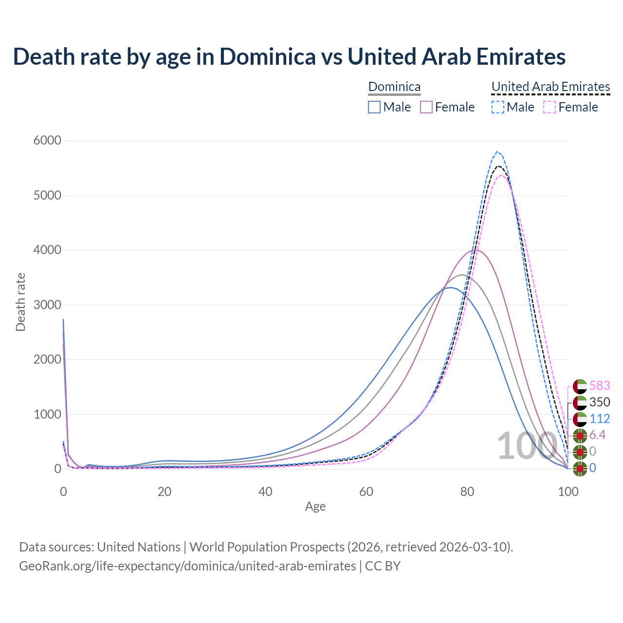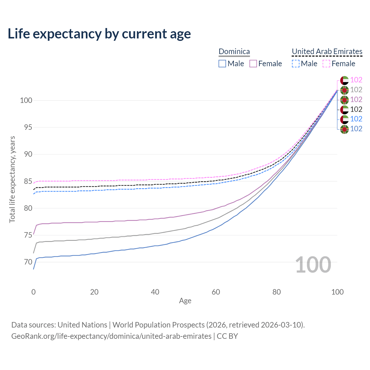 This life expectancy calculator shows the odds of living to 100, 95, 90, and below based on current age for both males and females in Dominica and the United Arab Emirates, along with mean and median age of death. The calculations are based on the 2026 life tables (actuarial tables) from the UN World Population Prospects.