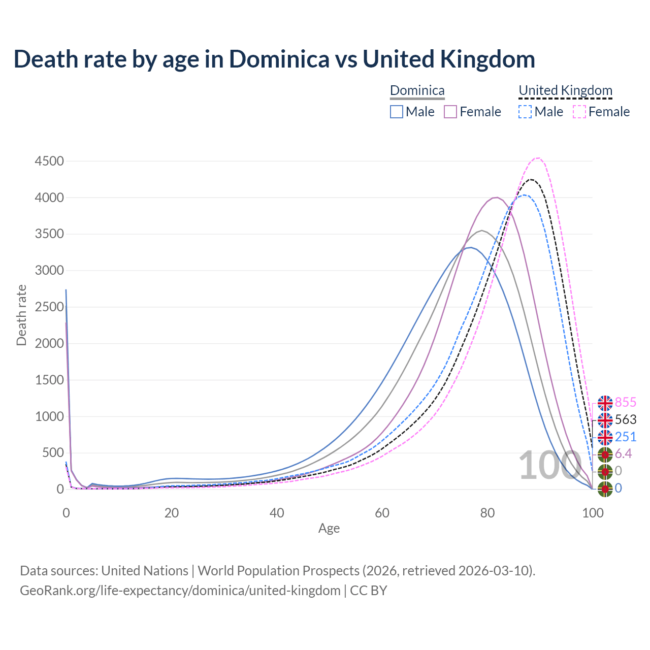 In Dominica, the most common age of death is 79, compared to 88 in the United Kingdom. The median age of death is 75.9 in Dominica and 84.9 in the United Kingdom, meaning only half of each cohort is expected to live past that age.